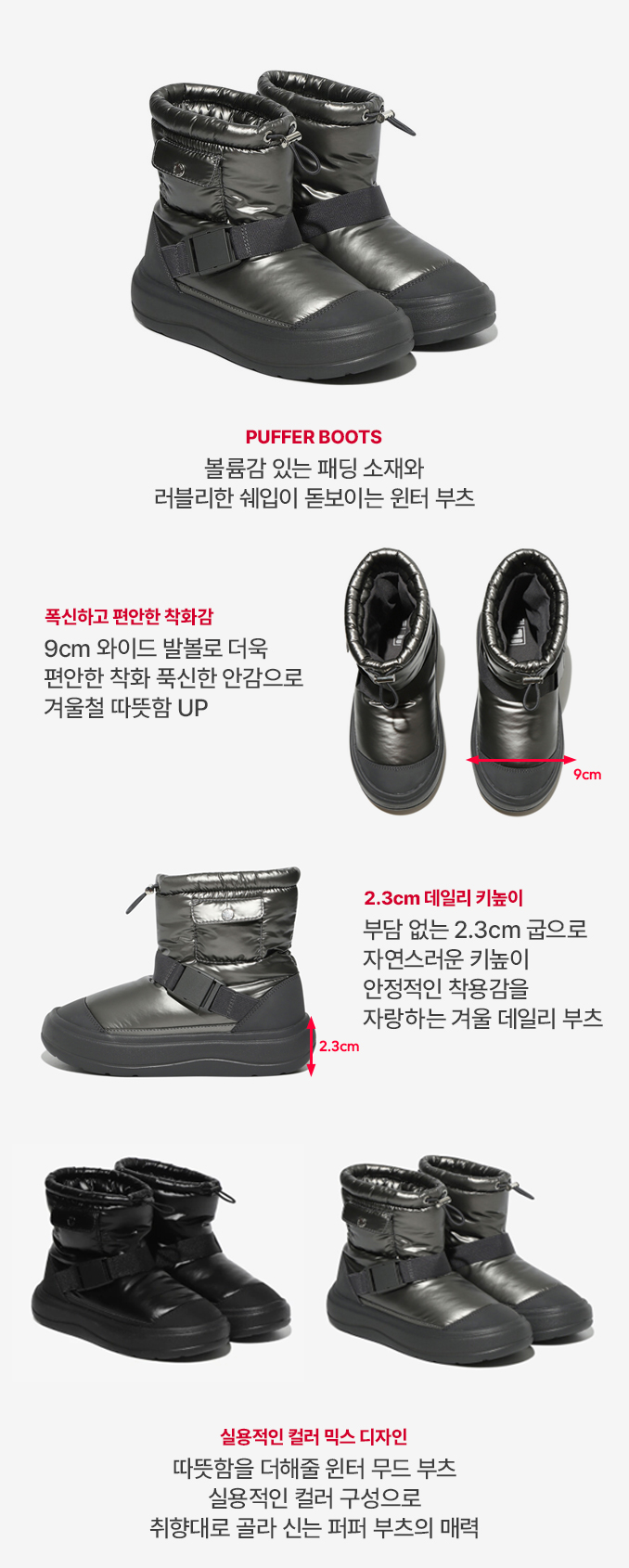 빵빵한 패딩 소재에 휠라만의 동글동글한 앞코 쉐입으로 발을 작아보이게 연출해주며 사이드 포켓 포인트로 귀엽고 사랑스러운 실루엣을 만들어줍니다.