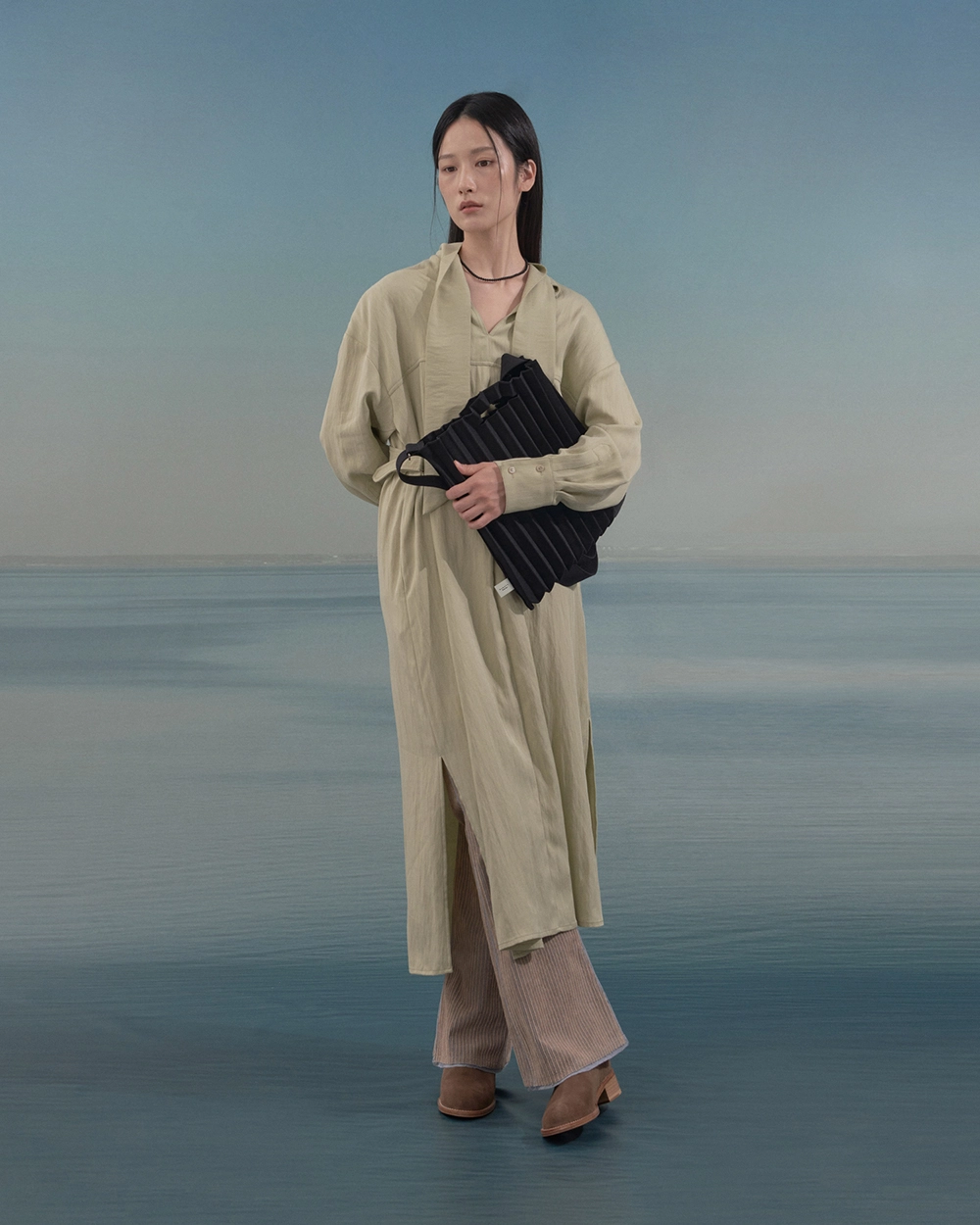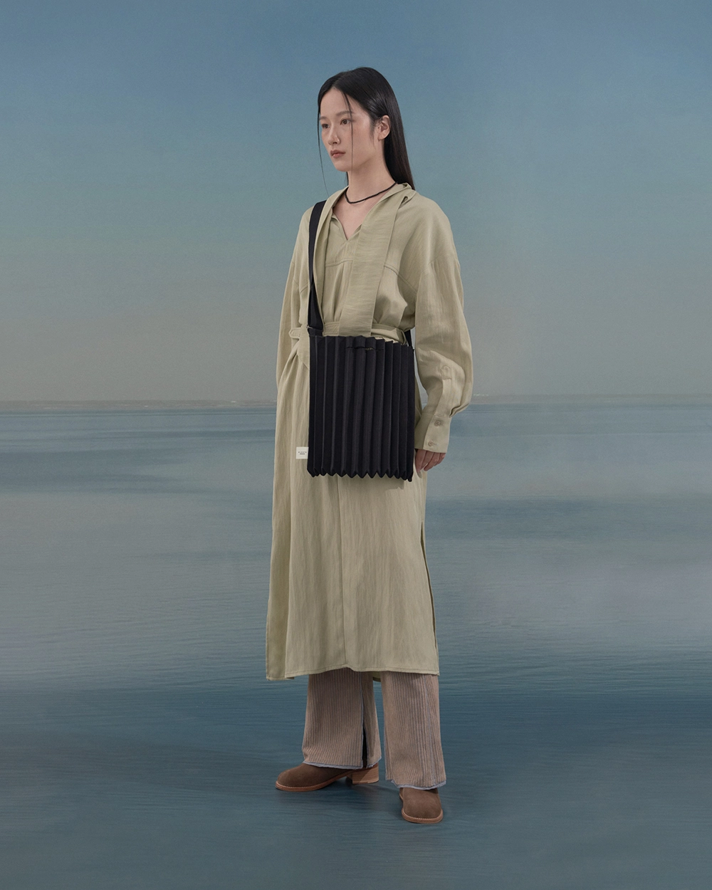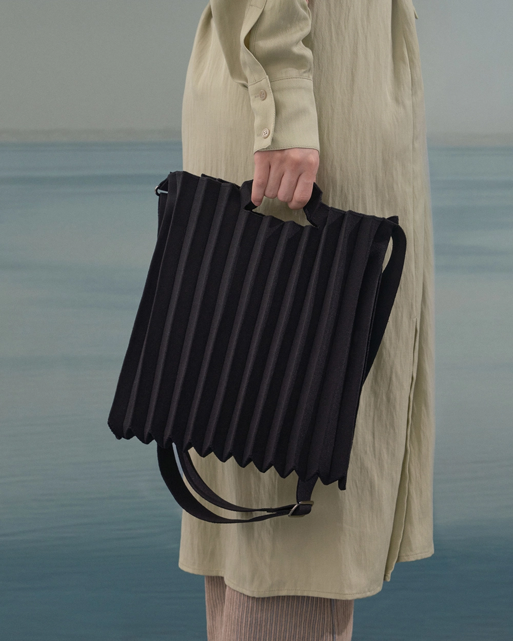 PLEATSMAMA Studio Bag 是品牌經典摺紋背包系列之一,主打寧靜色調,多功能設計可作肩背、手提或斜背使用。此款背包由回收漁網再生紗製成,強調環保理念與高耐用性,堅固結構讓包型穩固且輕盈。包體採用彈力針織摺紋設計,寬度可從25cm伸展至37cm,適合收納日常必需品、13寸筆記本等。肩帶長度可調整,從33cm到70cm不等,肩帶寬4.2cm,手提帶寬9~11cm,兼具功能與時尚。