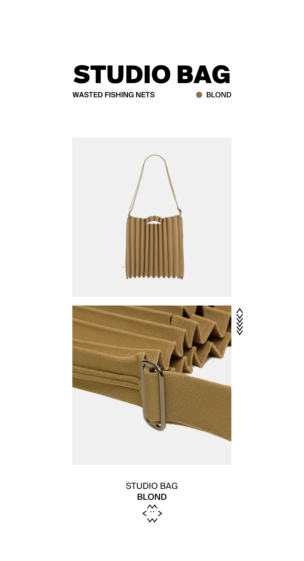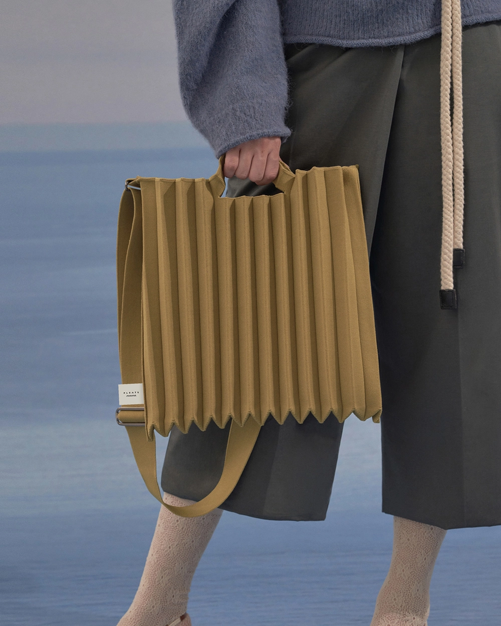 PLEATSMAMA Studio Bag 是品牌經典摺紋背包系列之一,主打寧靜色調,多功能設計可作肩背、手提或斜背使用。此款背包由回收漁網再生紗製成,強調環保理念與高耐用性,堅固結構讓包型穩固且輕盈。包體採用彈力針織摺紋設計,寬度可從25cm伸展至37cm,適合收納日常必需品、13寸筆記本等。肩帶長度可調整,從33cm到70cm不等,肩帶寬4.2cm,手提帶寬9~11cm,兼具功能與時尚。