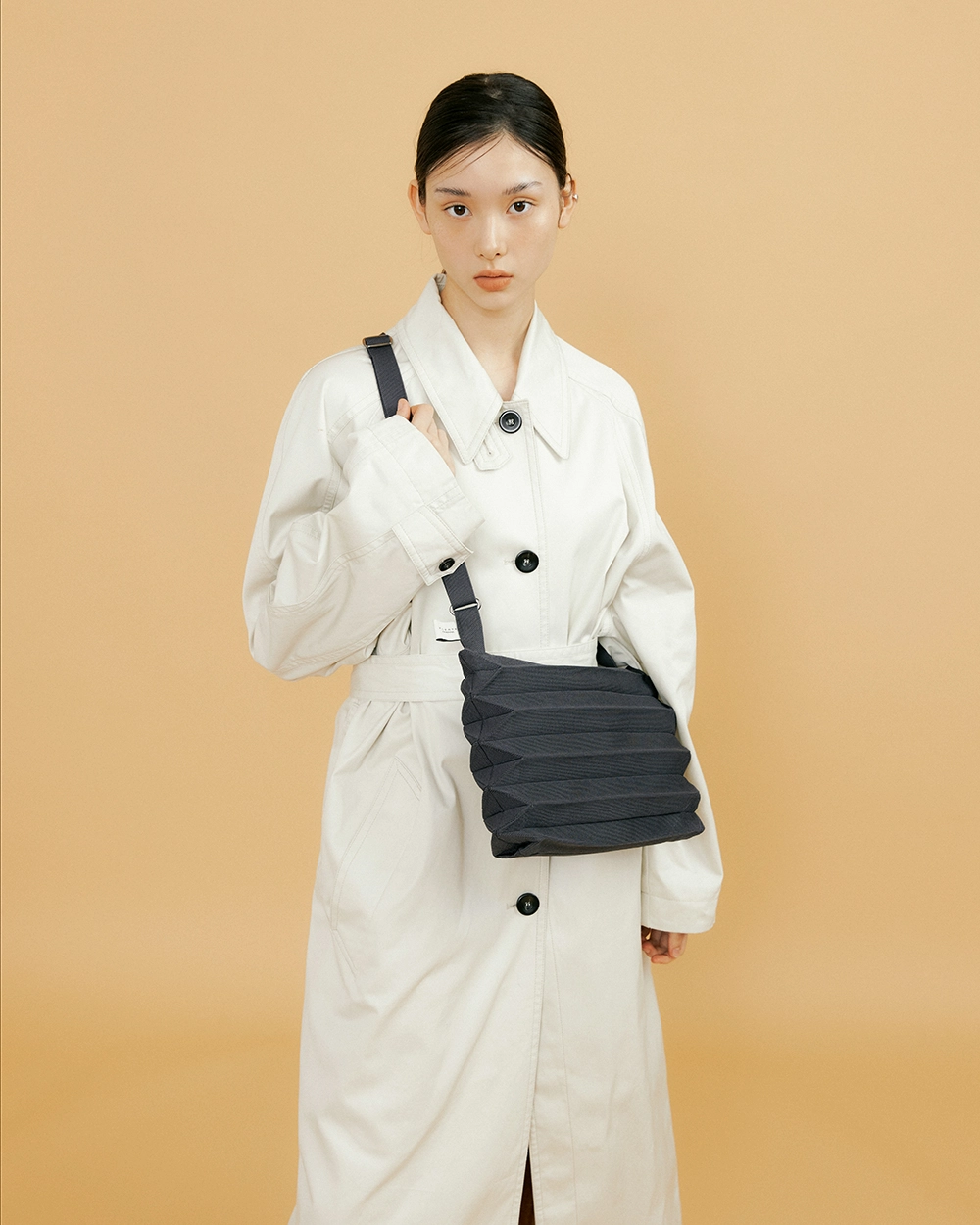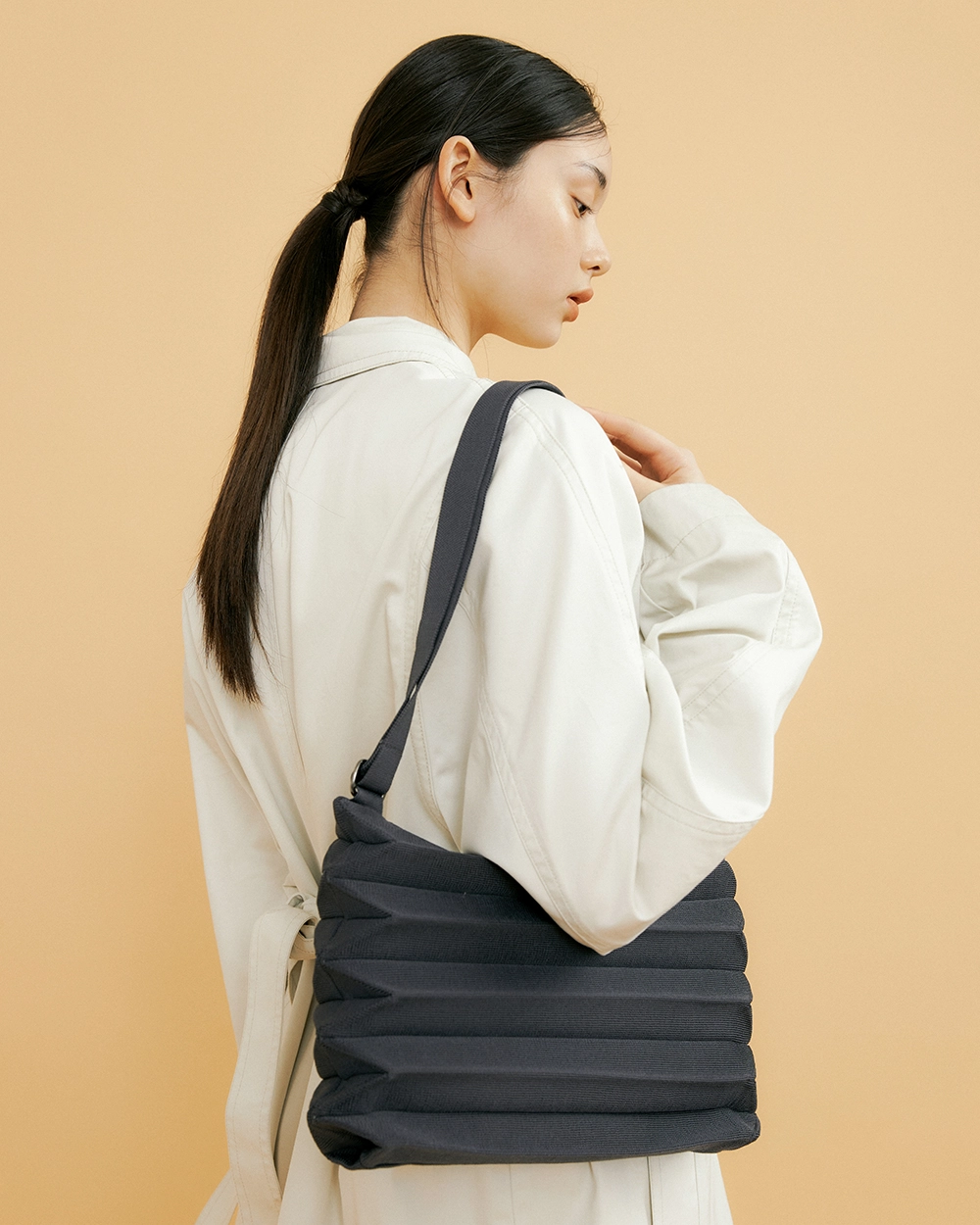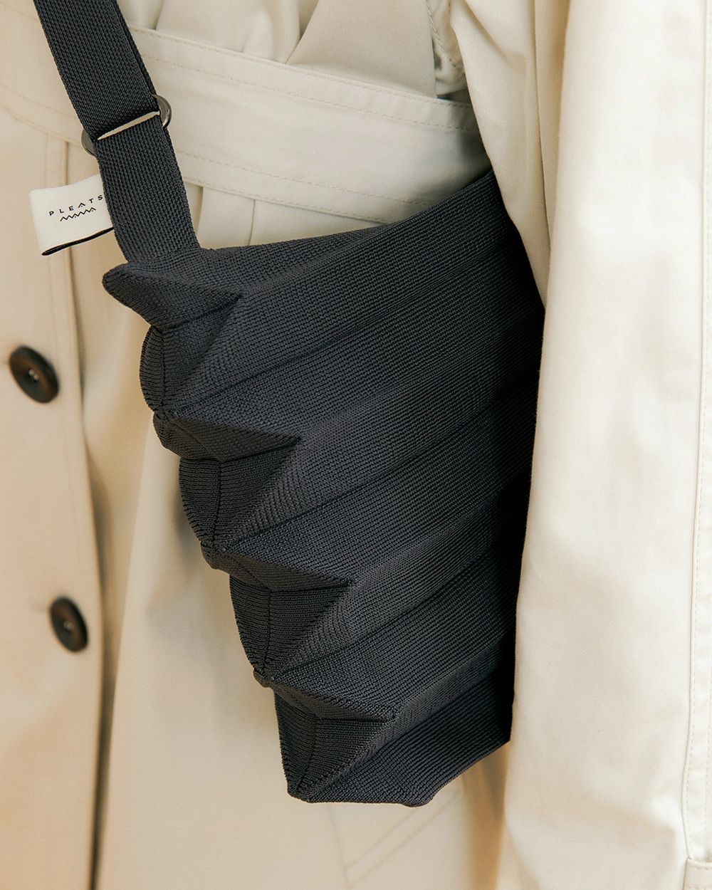 PLEATSMAMA New Sacoche Bag 採用回收聚酯纖維紗線製作,環保耐用且柔軟輕盈。包身設計寬敞,可容納11吋iPad,具多功能性,適合作為日常休閒包或旅行包使用。包面呈水平摺紋編織,兼具美觀與彈性,拉鍊設計確保物品安全。肩帶長度可調整(單邊約67cm),方便靈活背攜。簡約時尚設計,多色可選,符合現代可持續時尚理念。