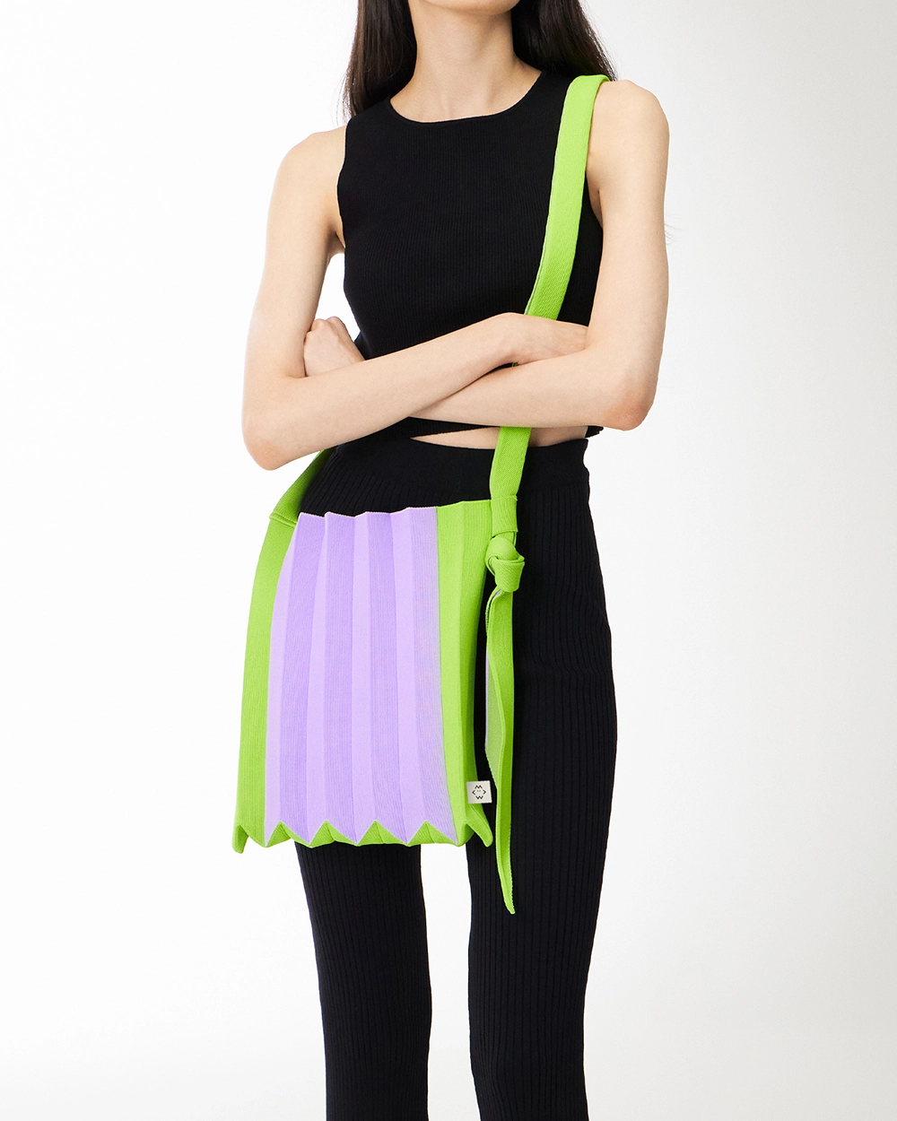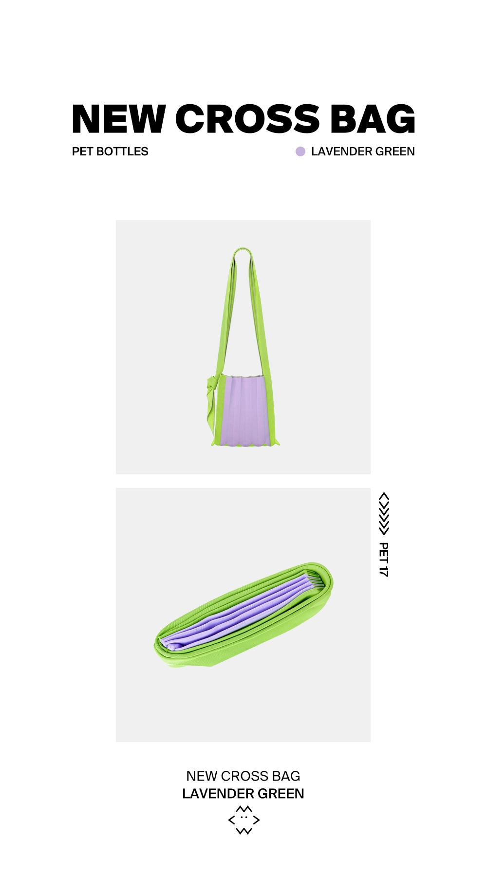 PLEATSMAMA New Cross Bag 採用品牌環保再生聚酯纖維與高彈性尼龍混紡製成,質地柔軟且耐用,表面為經典摺紋針織設計,舒適且富有彈性。包包搭載獨特X型壓花肩帶,防滑且可調節長度(約33cm至70cm),方便肩背或斜背。包體大小適中,足以裝載日常必需品,適合日常休閒及通勤使用。設計簡潔,兼具功能與美感,是可持續時尚的代表作。