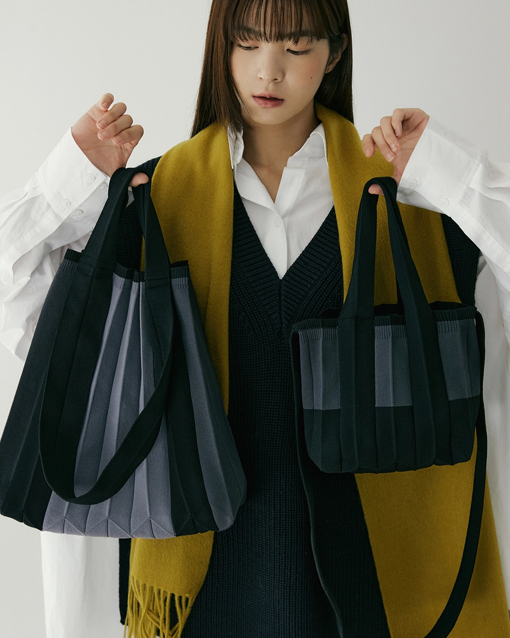 PLEATSMAMA的Two-Way Shopper Bag採用韓國製造的環保針織褶皺材質,結合時尚與實用性,是日常生活中的理想包款。此包具備兩種不同的背帶設計,可以輕鬆轉換成托特包(Tote Bag)或肩背包(Shoulder Bag),多種背法滿足各種場合需求。