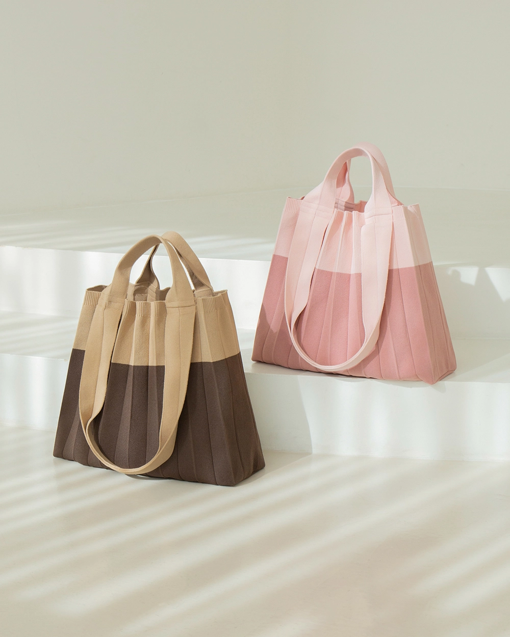 PLEATSMAMA的Two-Way Shopper Bag採用韓國製造的環保針織褶皺材質,結合時尚與實用性,是日常生活中的理想包款。此包具備兩種不同的背帶設計,可以輕鬆轉換成托特包(Tote Bag)或肩背包(Shoulder Bag),多種背法滿足各種場合需求。