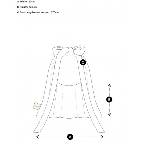 包包體積小巧(約20cm寬、12.5cm高),搭配67.5cm可調整肩帶,方便肩背,並可將肩帶綁成蝴蝶結,增添可愛時尚感。適合攜帶手機、錢包、卡片等小物,是日常外出或派對的理想選擇。