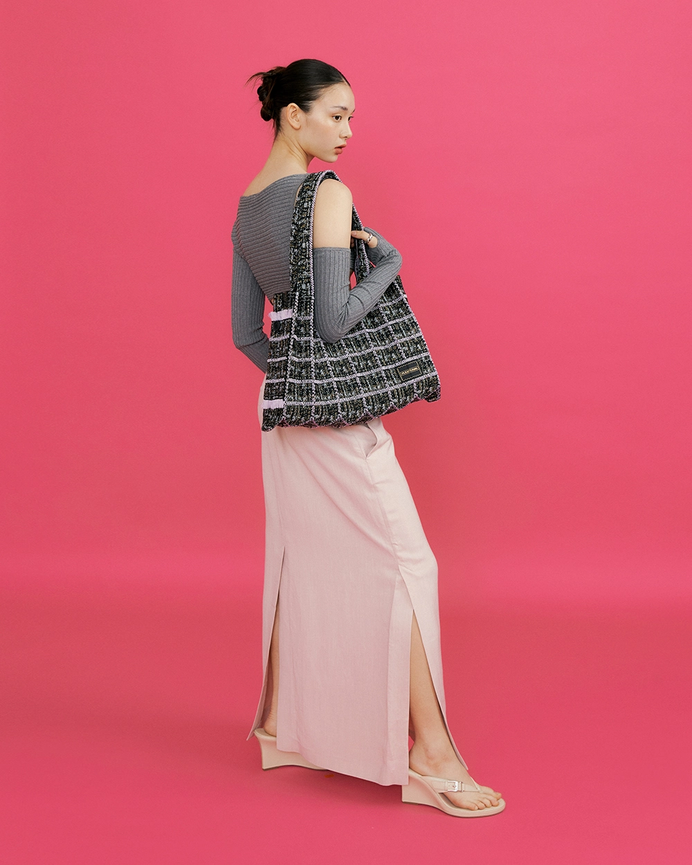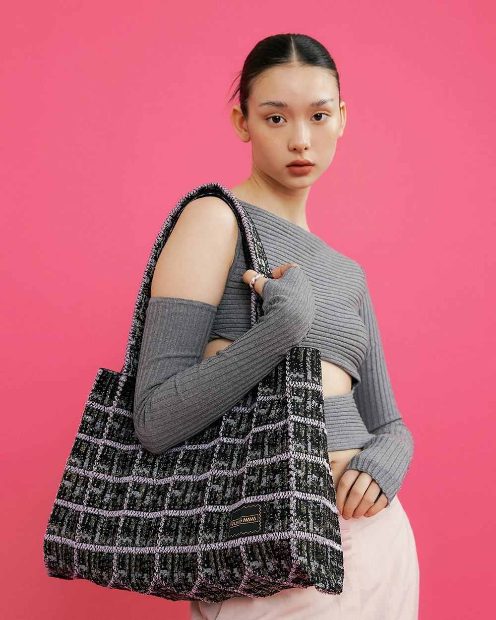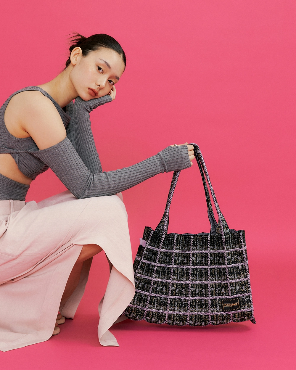 PLEATSMAMA Tweed Shopper Bag 以經典高貴的小香風為設計靈感,採用韓國最新針織工藝,把閃爍感的金屬色線點綴於柔美色調中,營造細緻高雅的氣質。包款呈現方形寬敞結構,方便整理和收納物品,是日常出門與假日聚會的時尚首選。