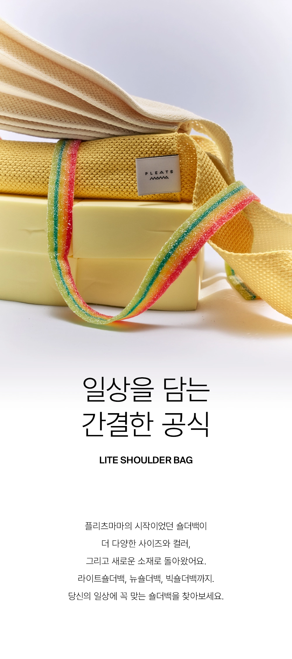 Light Shoulder Bag 以 PLEATSMAMA 的招牌壓褶編織結構為基礎,打造輕巧且柔軟的日常容器,強調便於肩背、不易產生負擔的設計理念。可輕鬆肩背的自然貼合設計,適合長時間使用也不感疲累。整體輕盈柔軟,容量佳,皺褶質地具有一定的延展性與形塑能力。