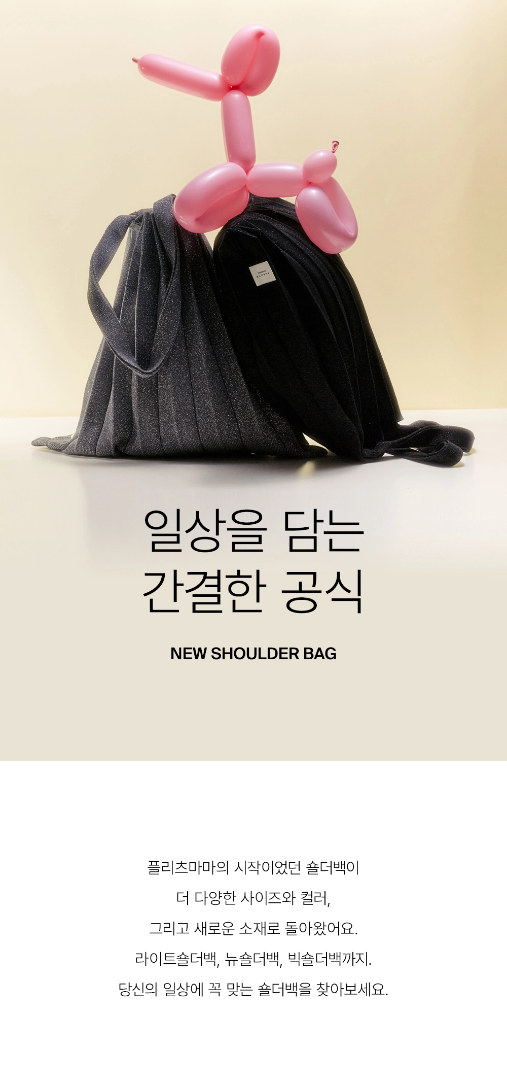 New Shoulder Bag 是 PLEATSMAMA 全新系列的標誌性容量肩背包,採用品牌經典的壓褶針織工藝,兼具質感與實用機能 。除了純色,亦推出亮片款式如 Glitter Stone Brown(閃耀巧克力棕)等,增添華麗效果 。