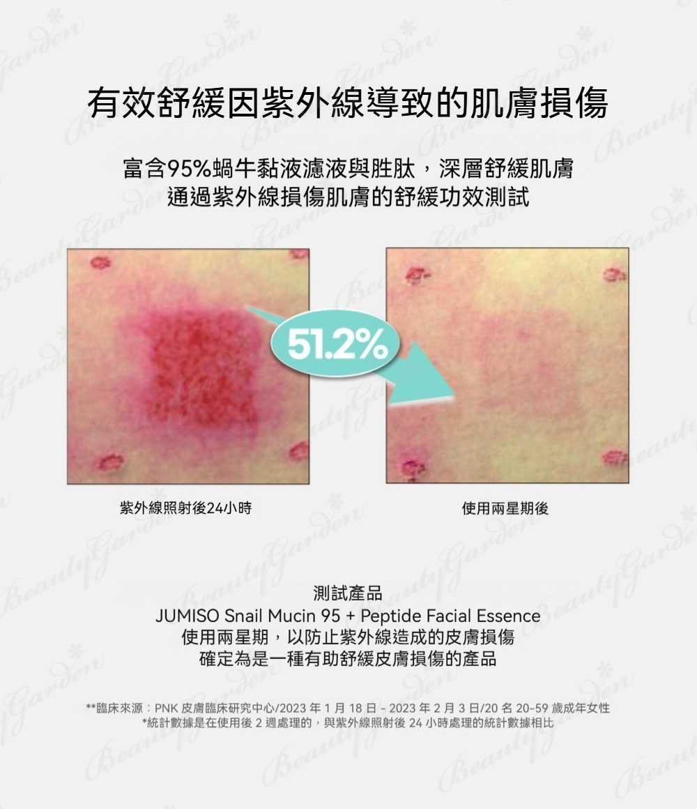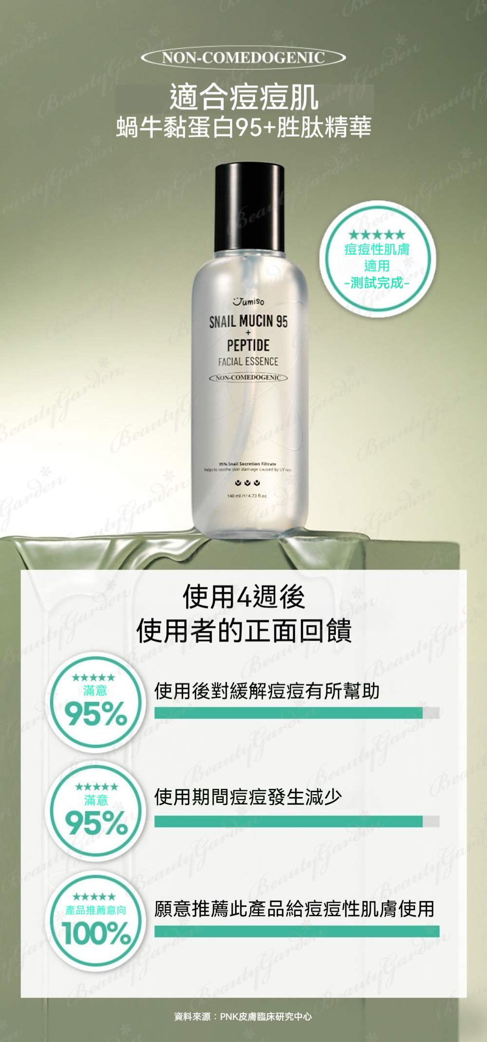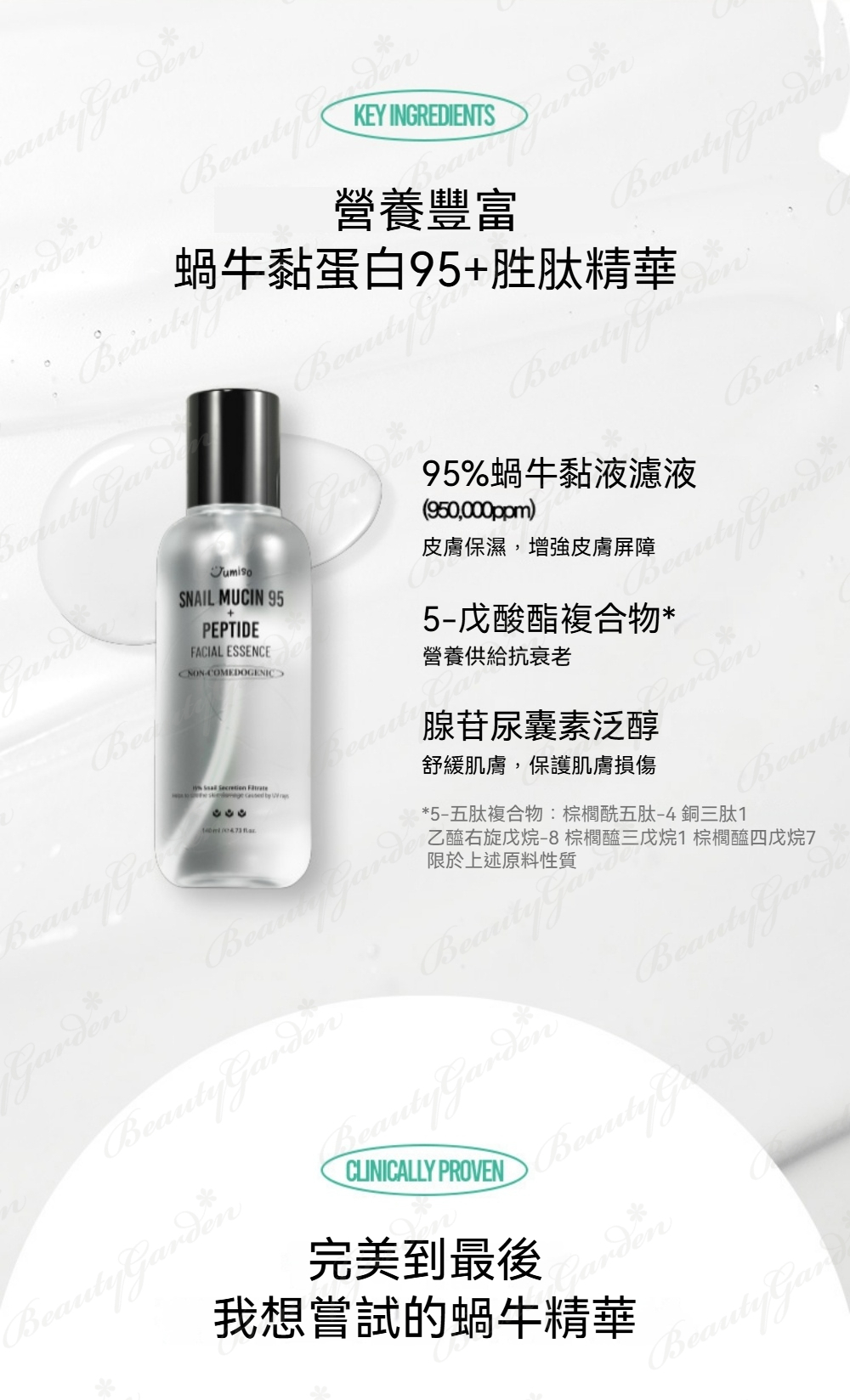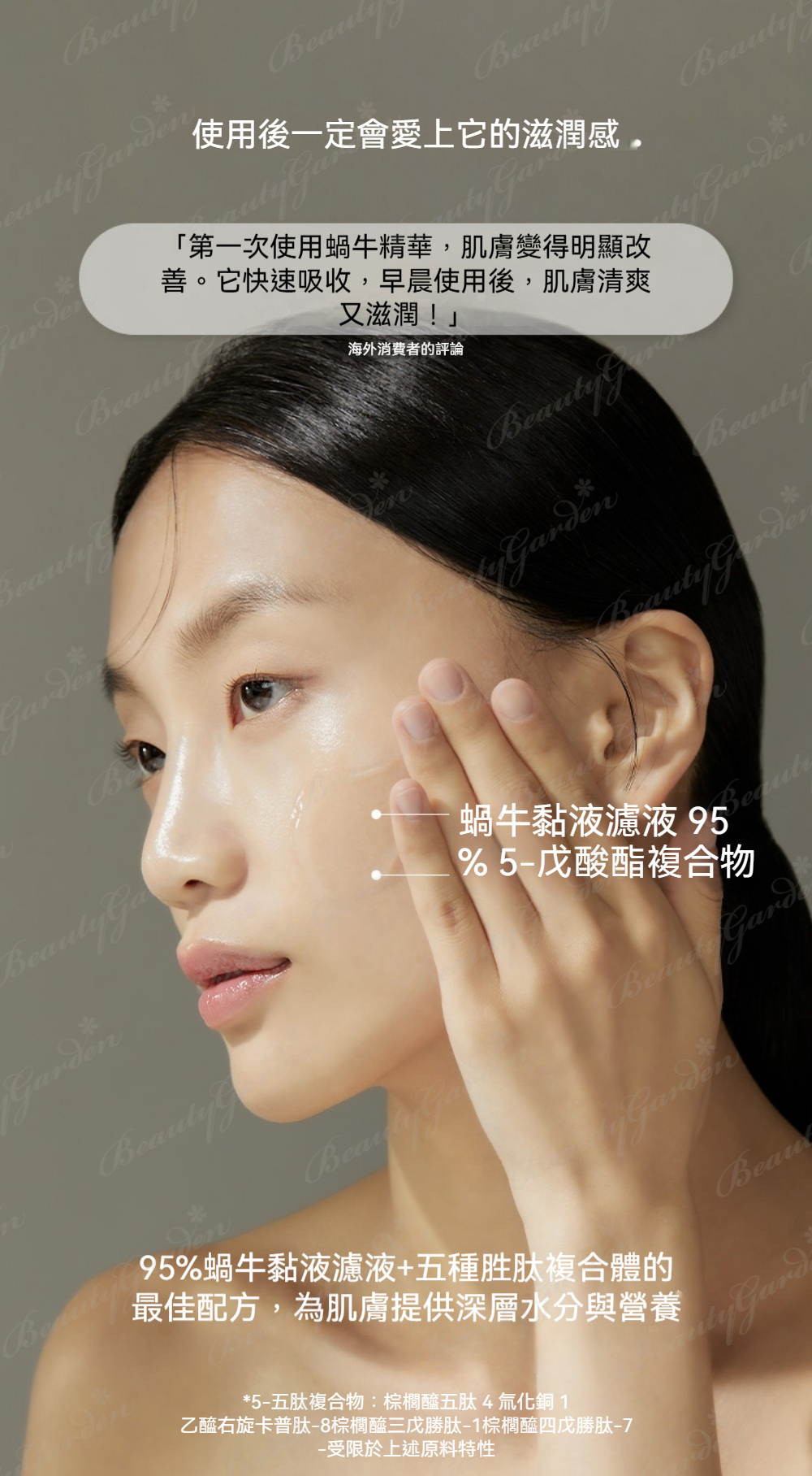 - 高濃度蝸牛黏液萃取(95%):提供深層保濕,促進肌膚修復與再生,改善粗糙與暗沉。