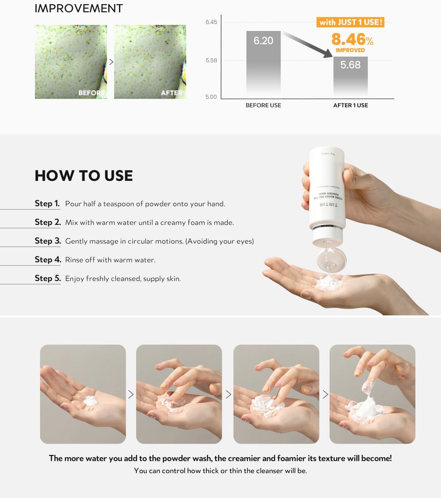 五種益生菌、專利酶、PHA和綠豆粉以及大米,透過深層清潔毛孔、去角質和均勻粗糙的皮膚,幫助清潔、水潤的皮膚和增強肌膚屏障。