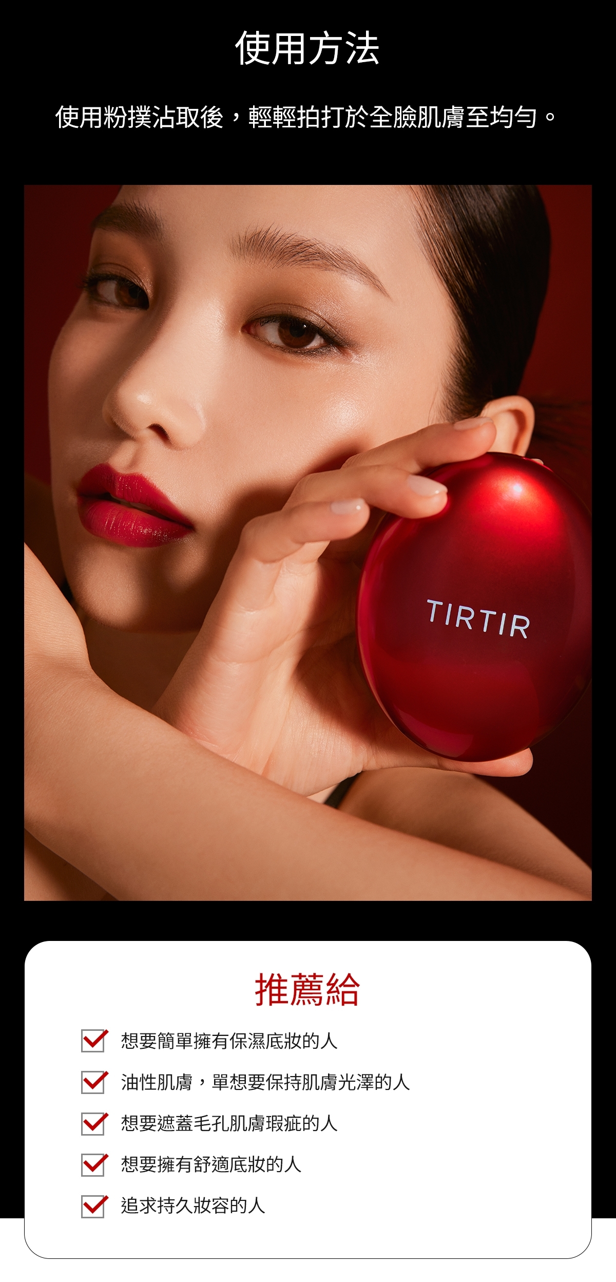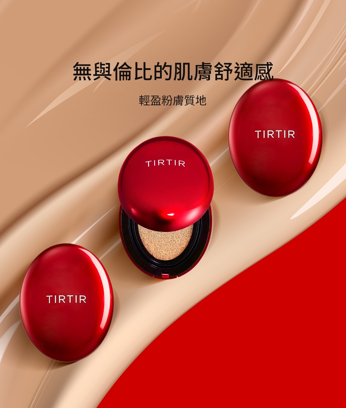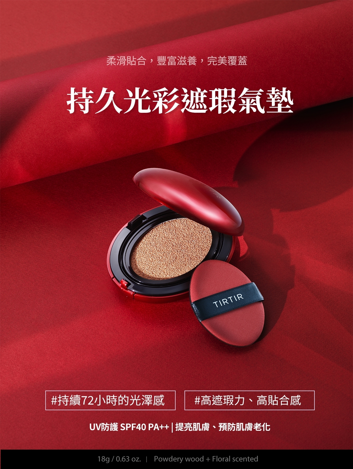 TIRTIR MASK FIT RED CUSHION 以持續肌膚 72 小時的優雅亮澤為賣點,蘊含蝦青素、蜂膠提取物、芙蓉花提取物三重護膚成份,更特別添加抗衰老精華,有效滋潤和緊緻肌膚,化妝同時亦能保養肌膚。