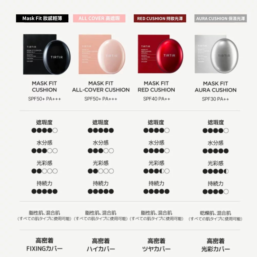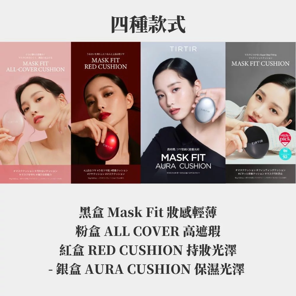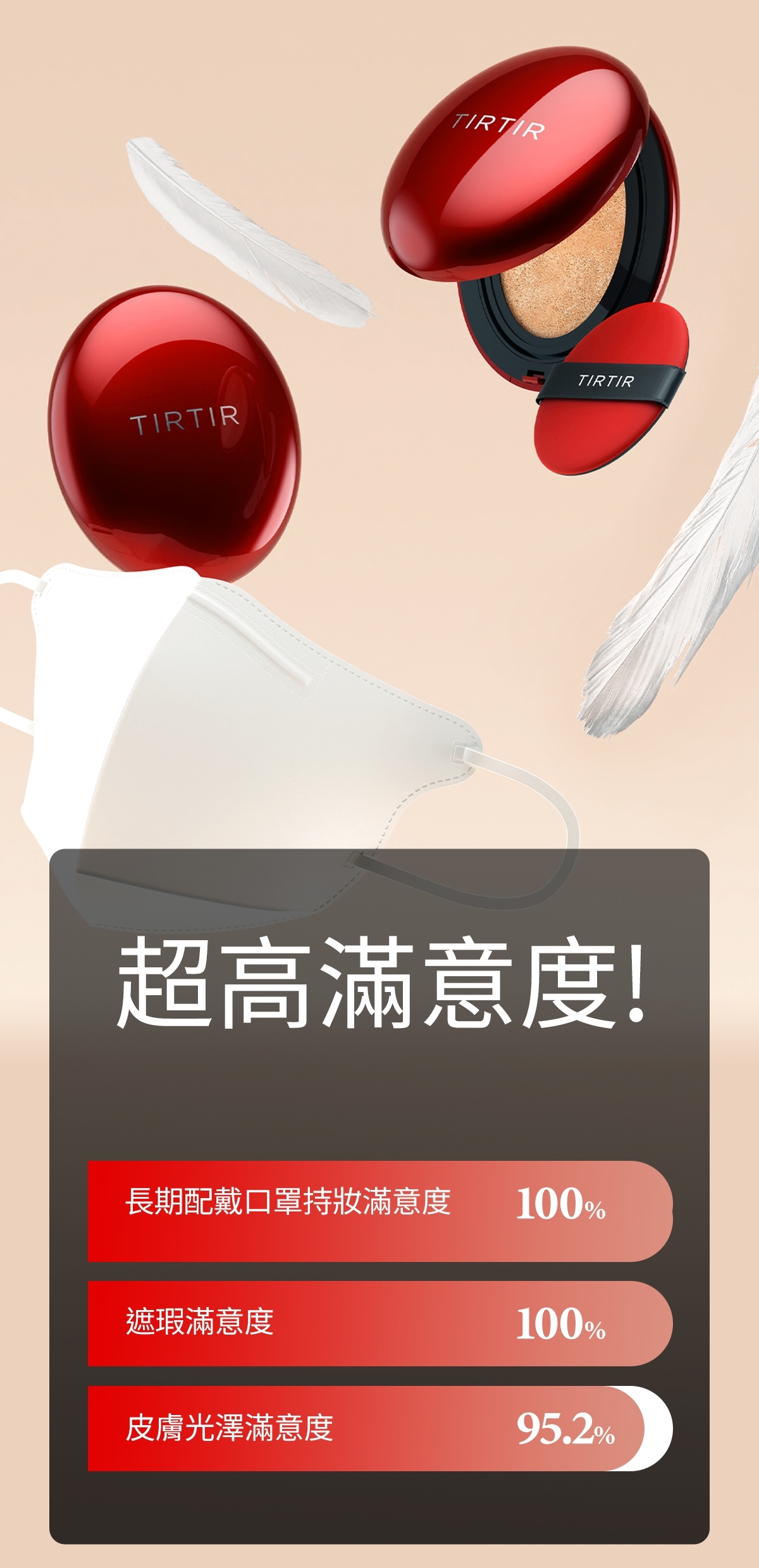 TIRTIR MASK FIT RED CUSHION 以持續肌膚 72 小時的優雅亮澤為賣點,蘊含蝦青素、蜂膠提取物、芙蓉花提取物三重護膚成份,更特別添加抗衰老精華,有效滋潤和緊緻肌膚,化妝同時亦能保養肌膚。