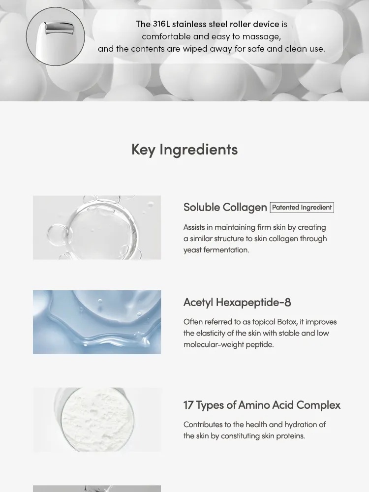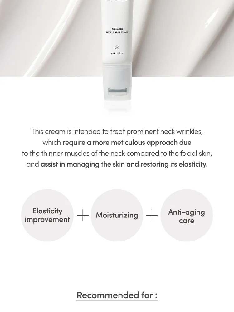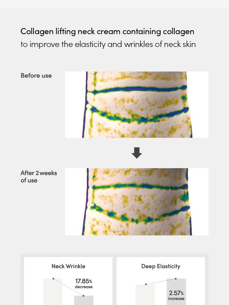 - 75% 膠原萃取 + Acetyl Hexapeptide 8 + 17 種胺基酸複合物:提升肌膚緊緻度與彈性,有效減淡頸紋與細紋。