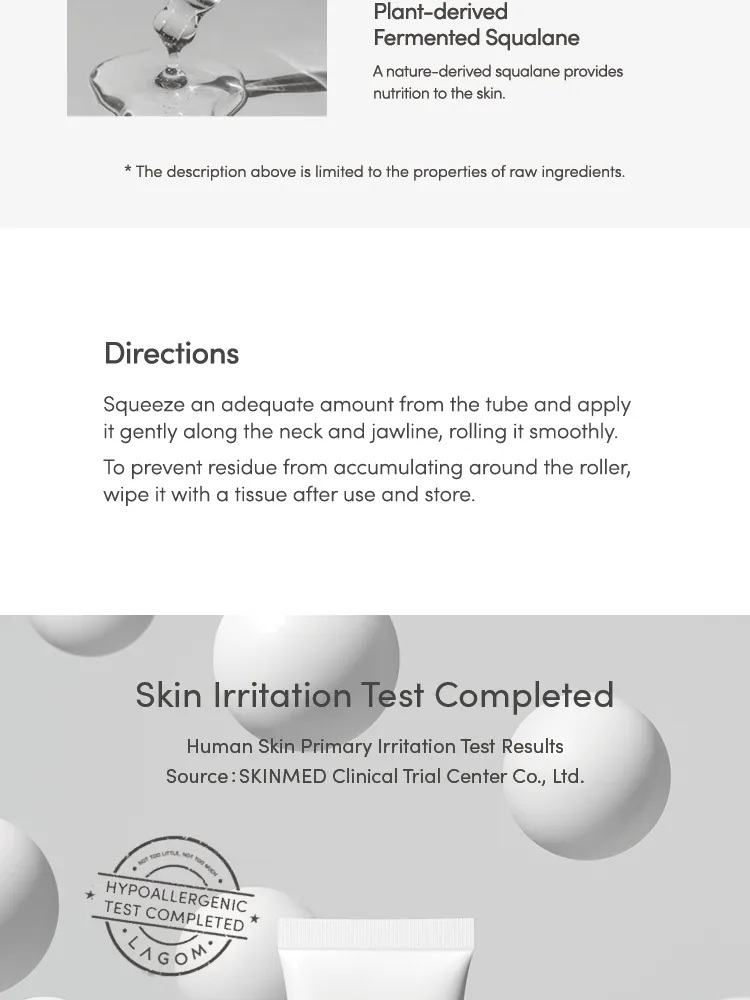 產品具有滾輪頭設計,可搭配按摩使用,促進吸收與微循環,質地柔滑不黏膩,適合敏感肌使用,臨床驗證可提升彈性並減少頸紋(約17.85%)。