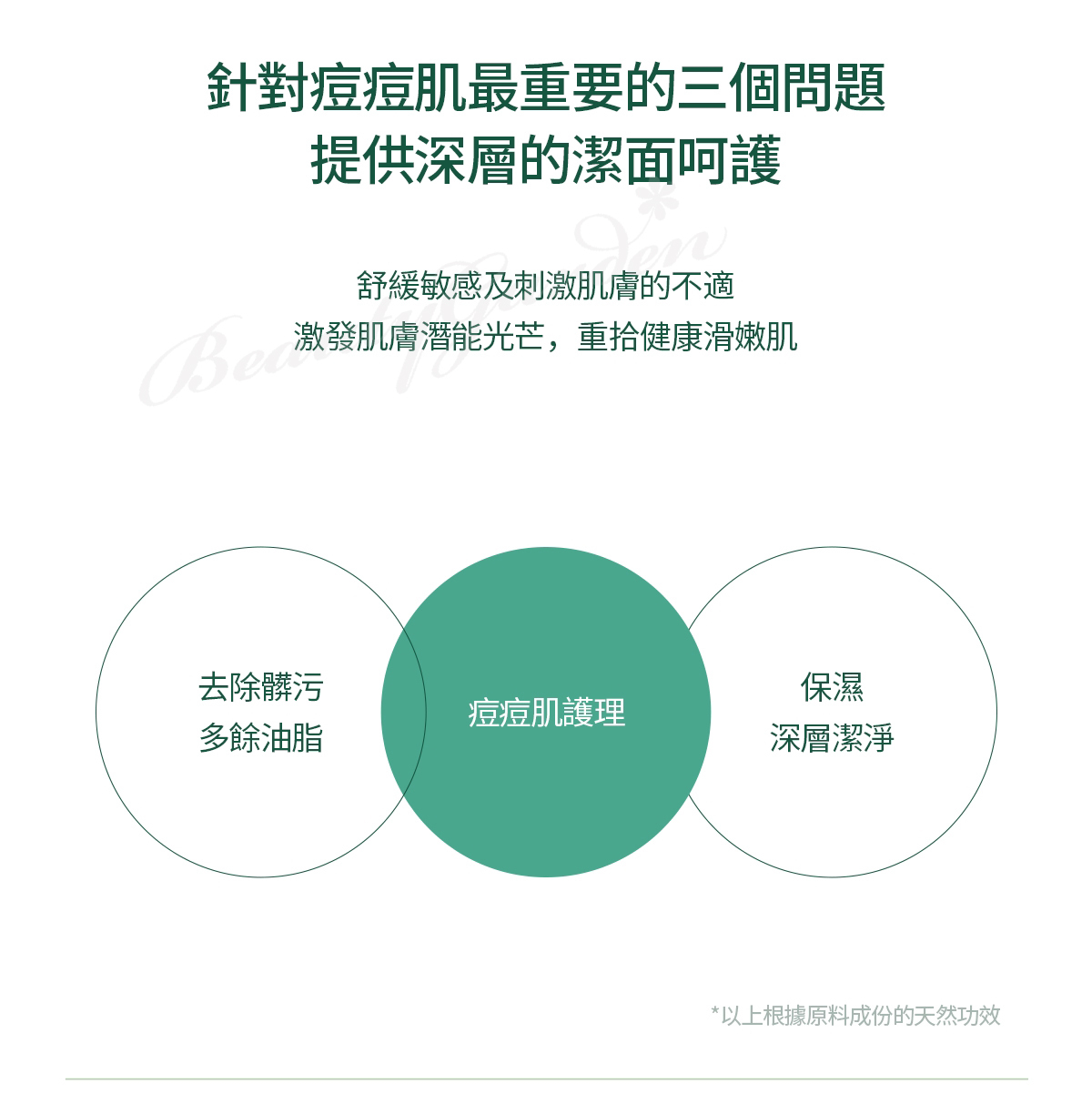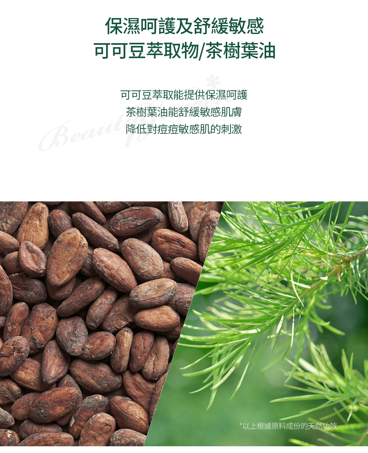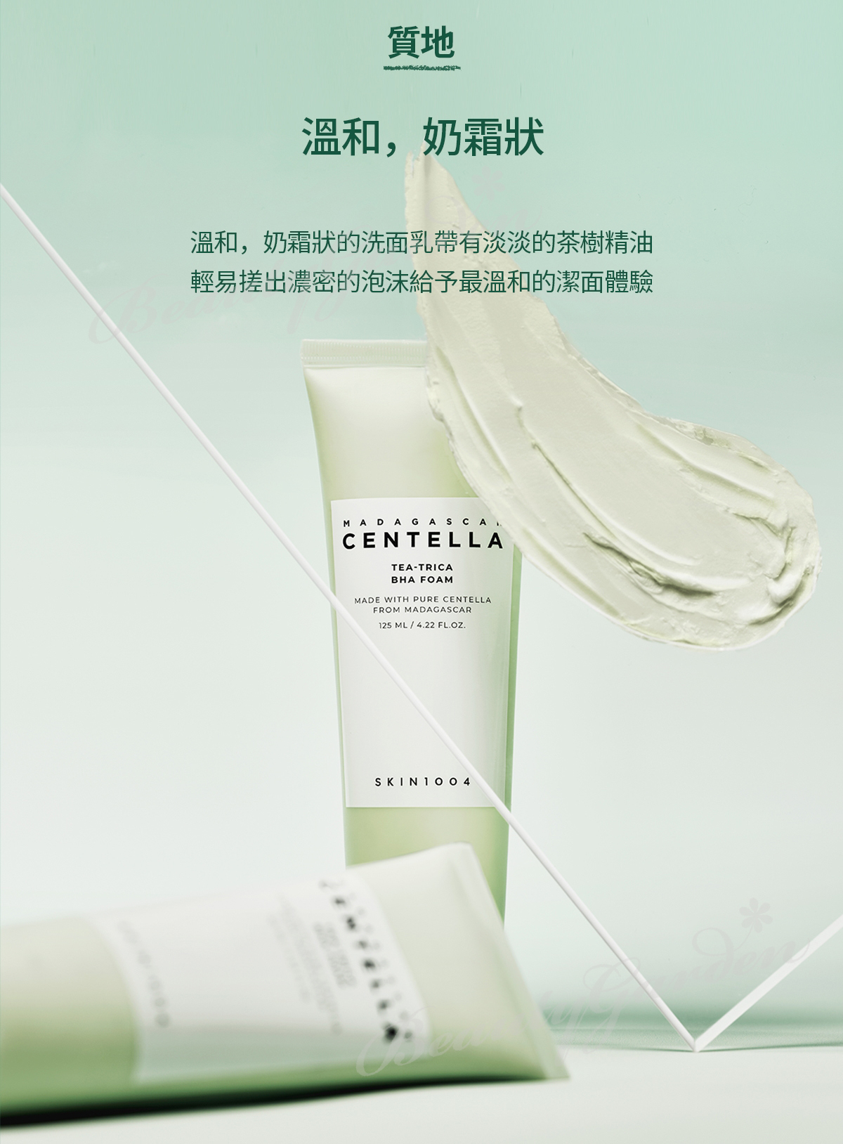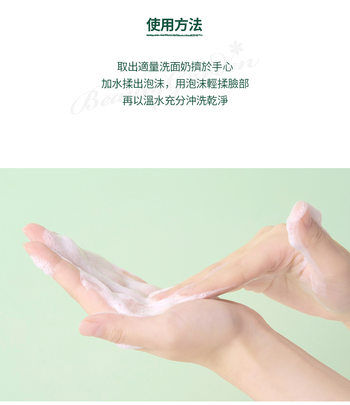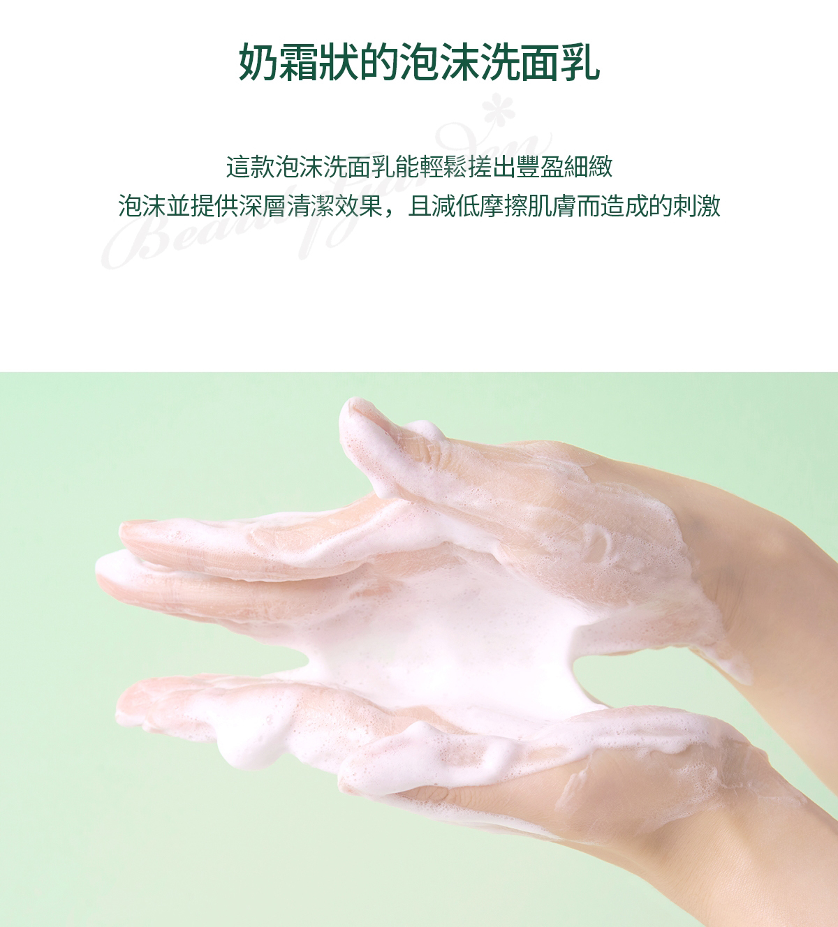 - 帶有淡淡茶樹香味,可形成濃密的泡沫,深層清潔肌膚