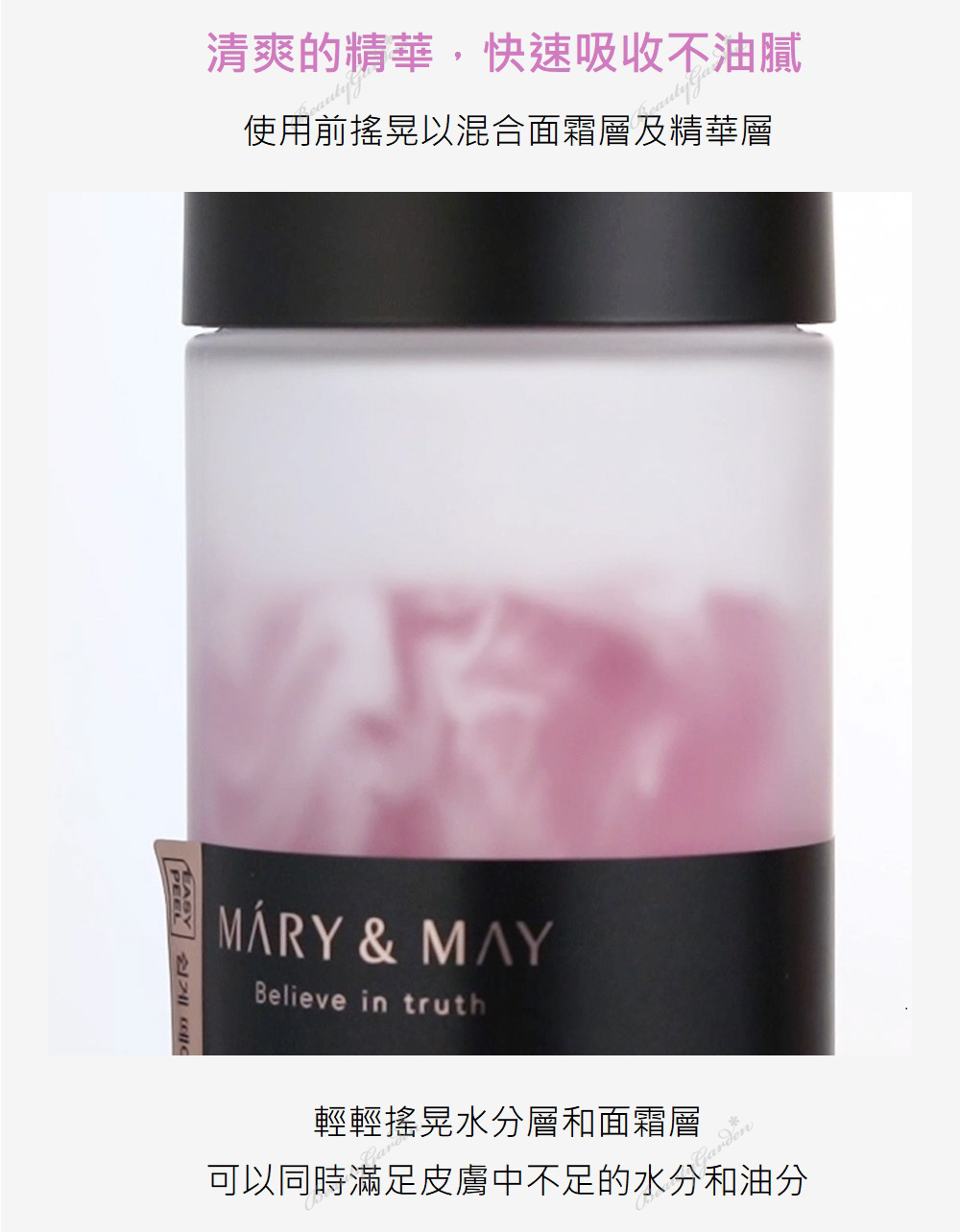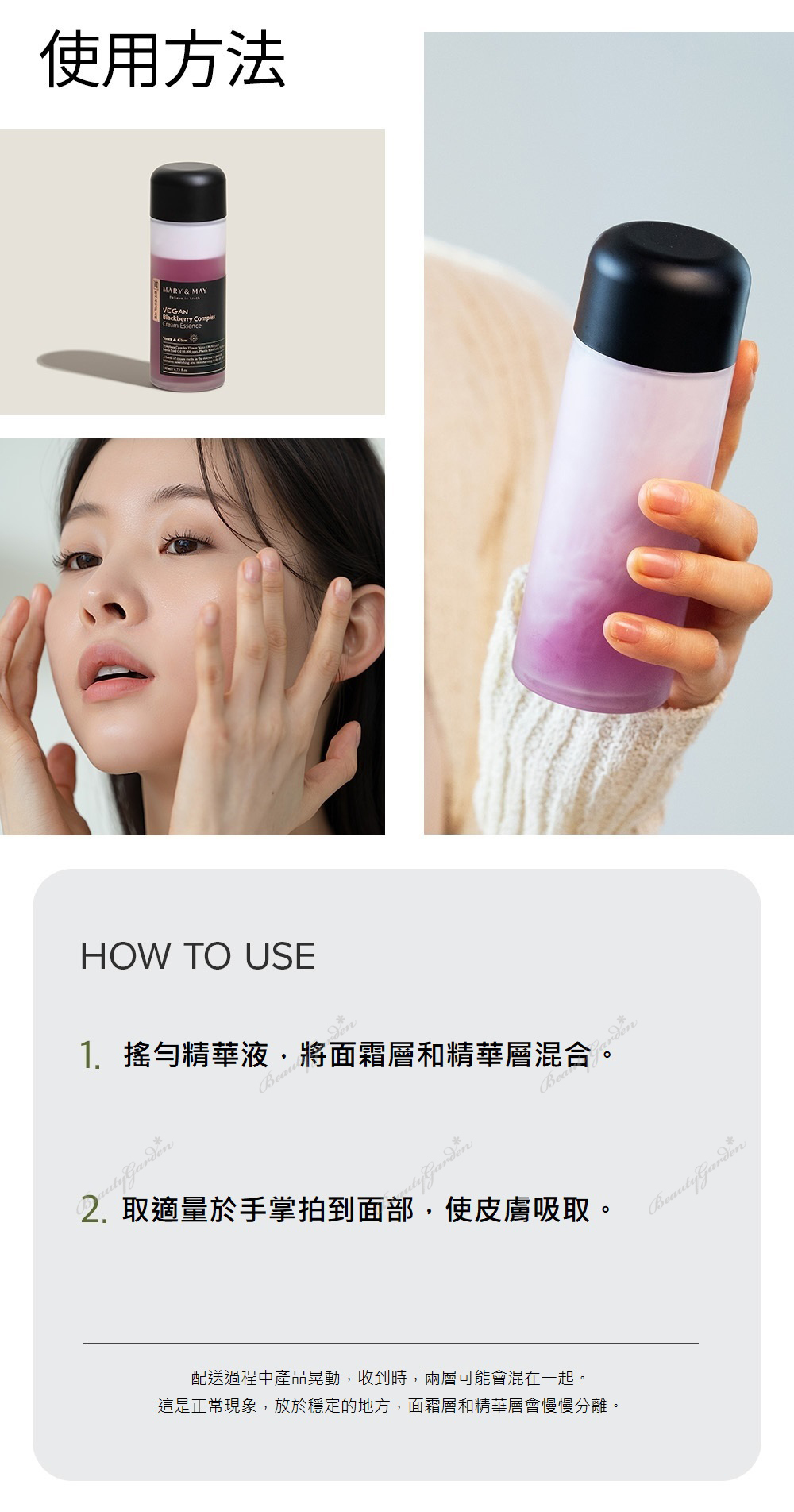 ⦁ 使用前輕輕搖晃瓶身混合精華與乳霜層。