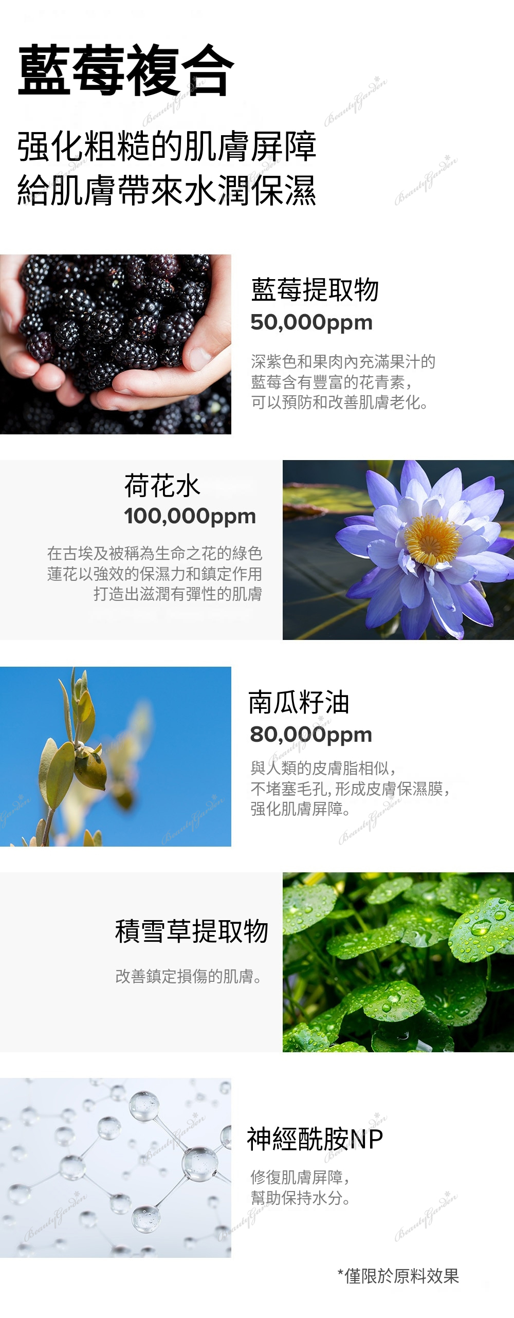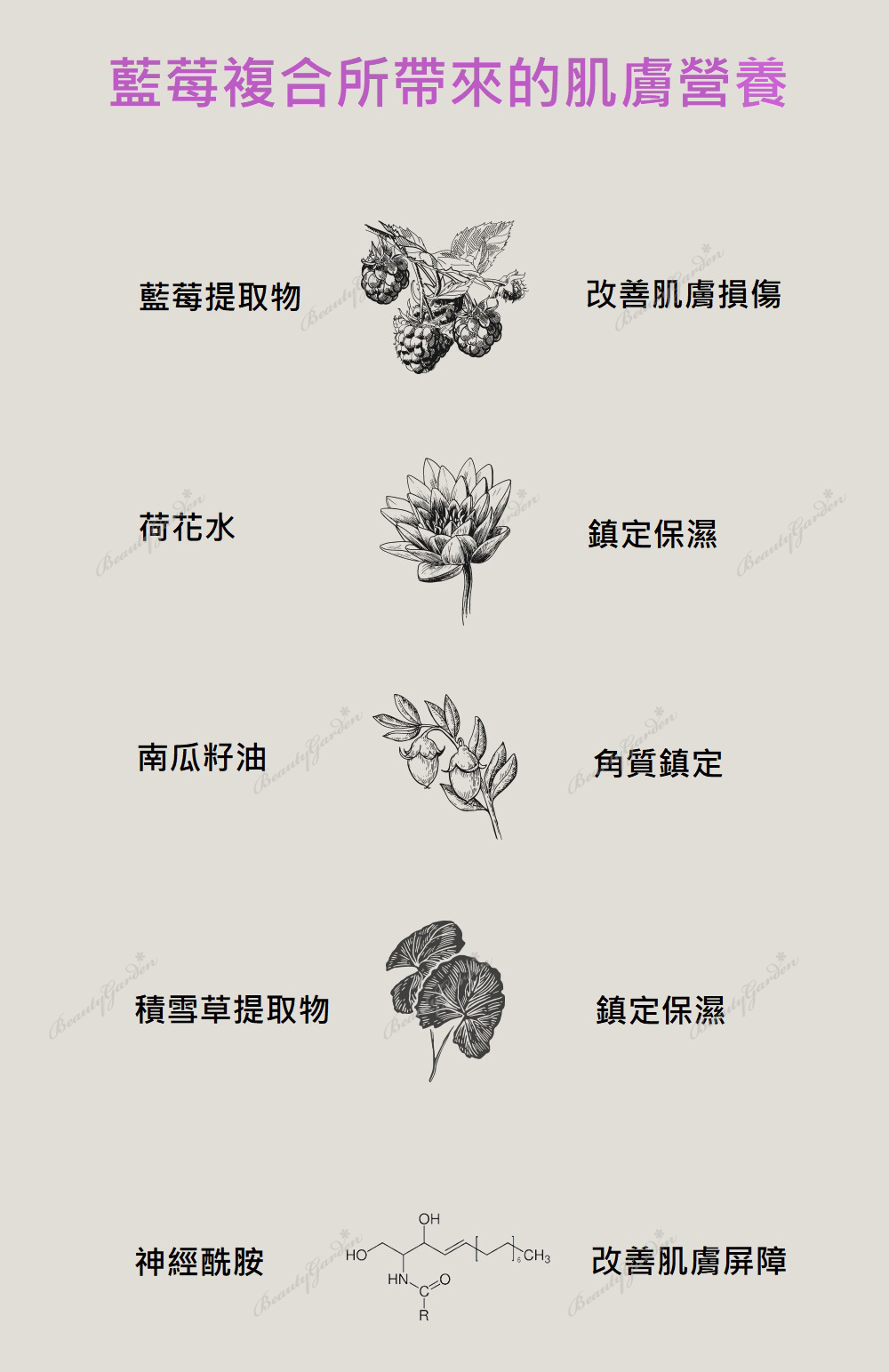 ⦁ 黑莓萃取 50,000ppm:富含花青素及維生素,強效抗氧化、抗老化,舒緩敏感,保持肌膚光澤彈性。