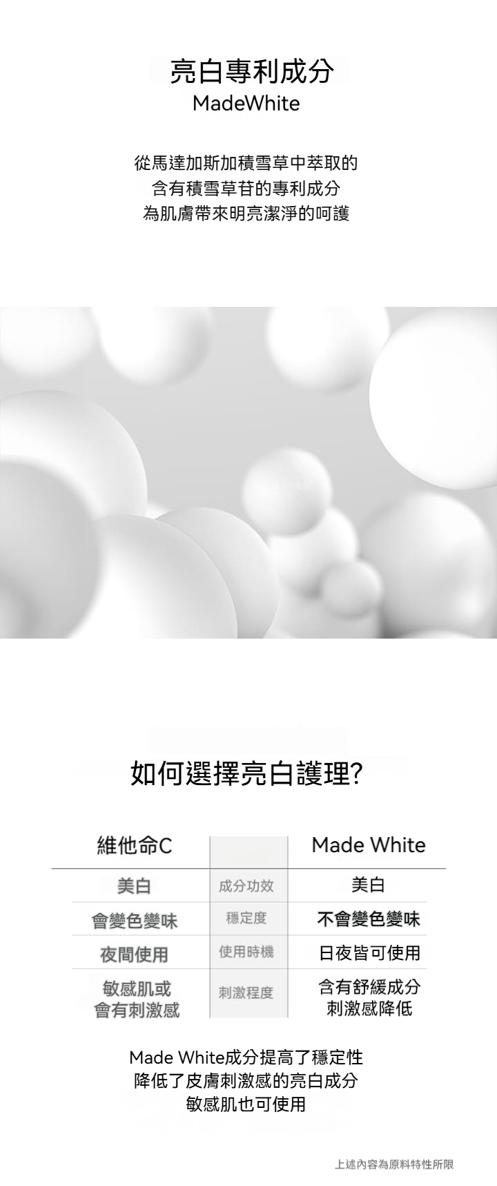 - Madewhite™(專利天然成分)提亮膚色,散發自然光澤
