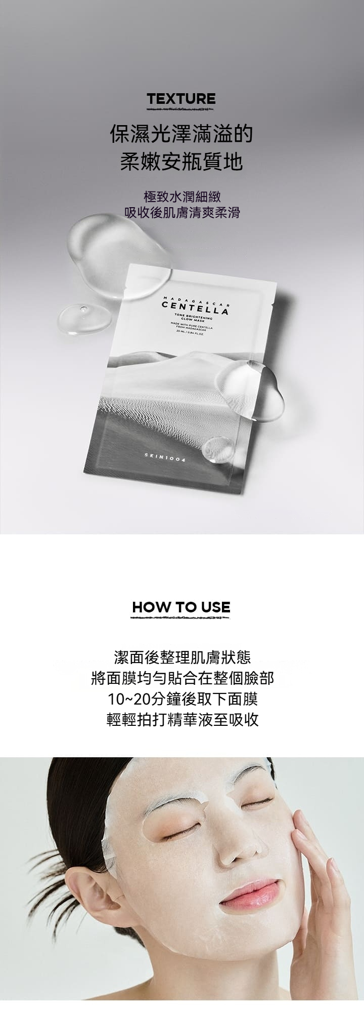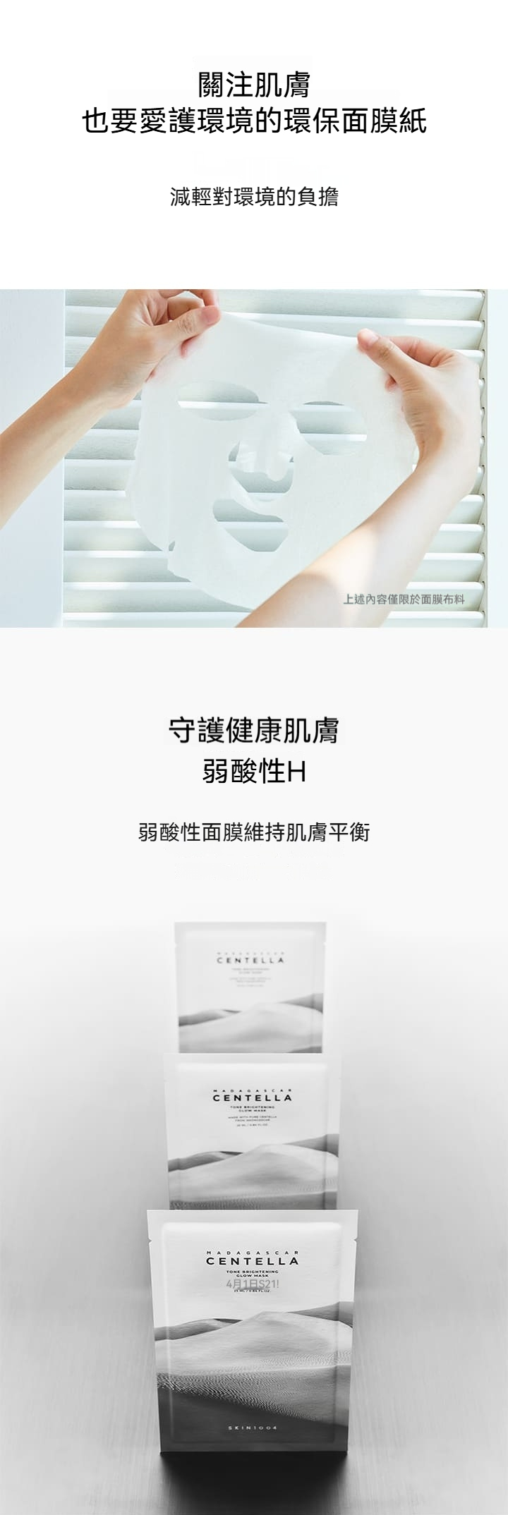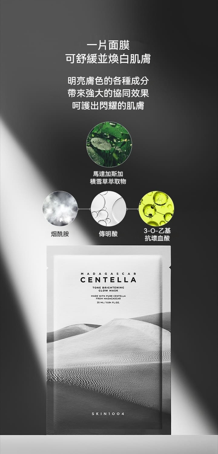 富含馬達加斯加積雪草和菸鹼醯胺精華的面膜讓肌膚煥發光彩。