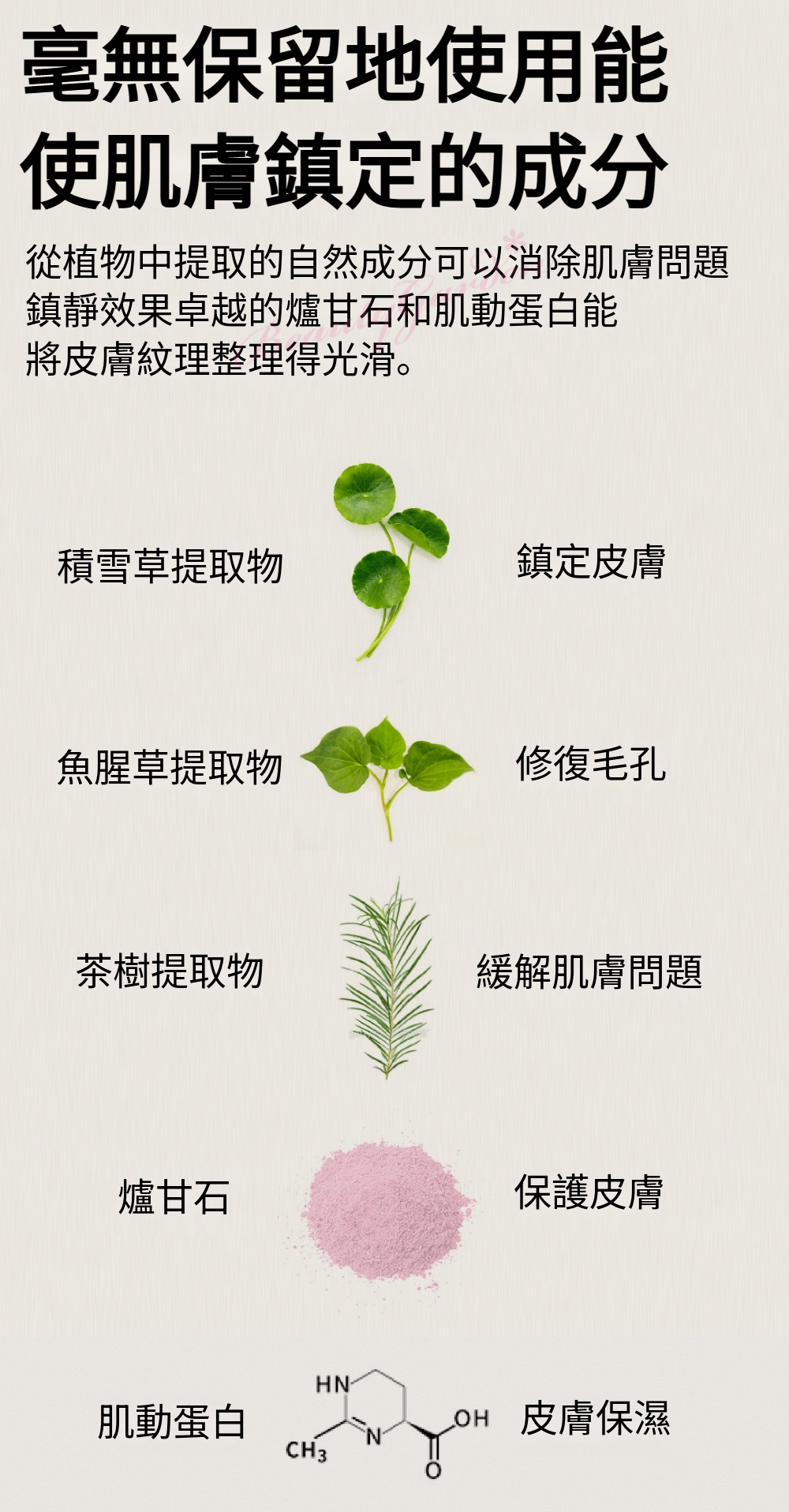 - 魚腥草萃取(Houttuynia Cordata):抗菌及減輕炎症,清潔毛孔,控制油脂。