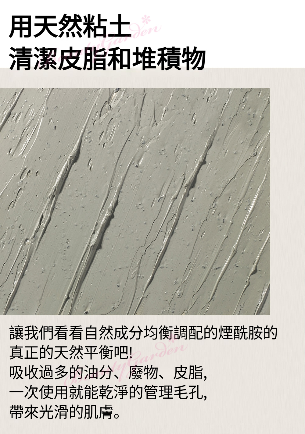 配方中含有爐甘石,進一步抑制暗瘡生成,同時使用天然柔軟的黏土,溫和吸附皮脂、老廢角質及毛孔雜質,令毛孔潔淨細緻並改善膚質粗糙。
