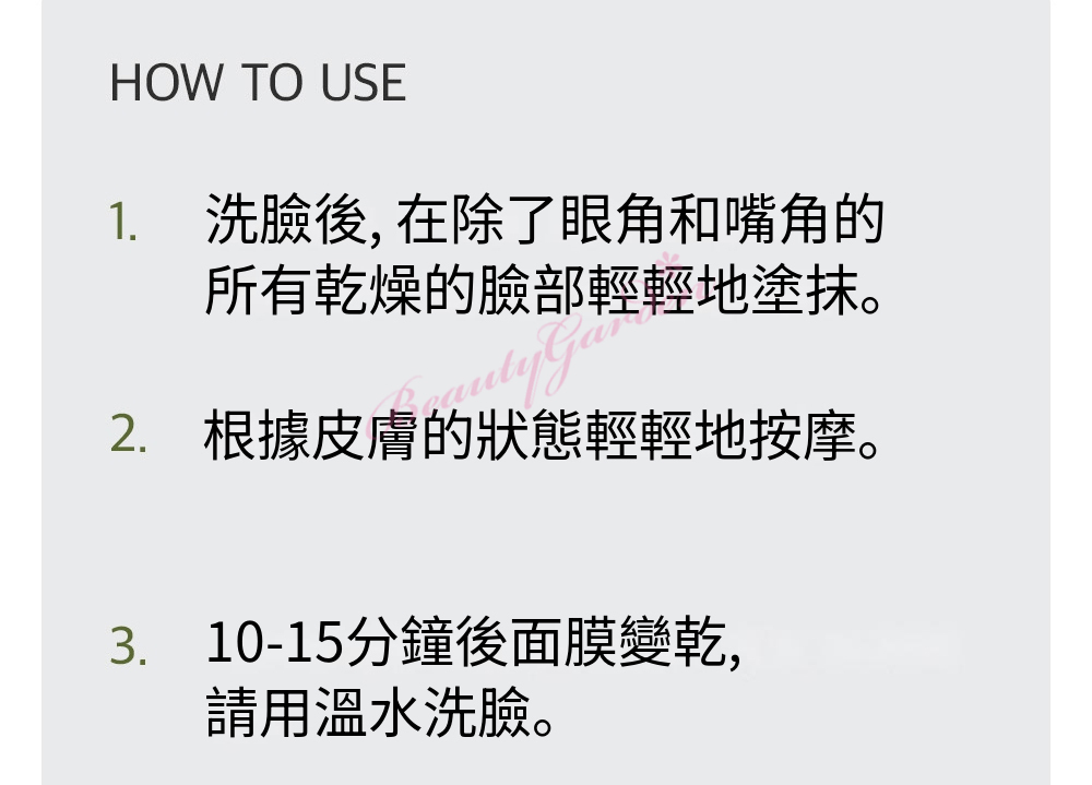 - 洗臉後取適量泥膜均勻塗抹於臉部(避開眼唇)。