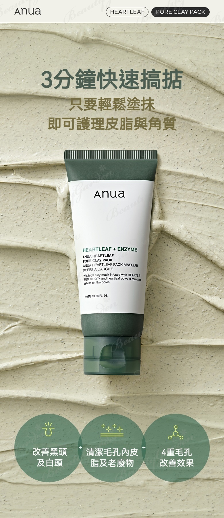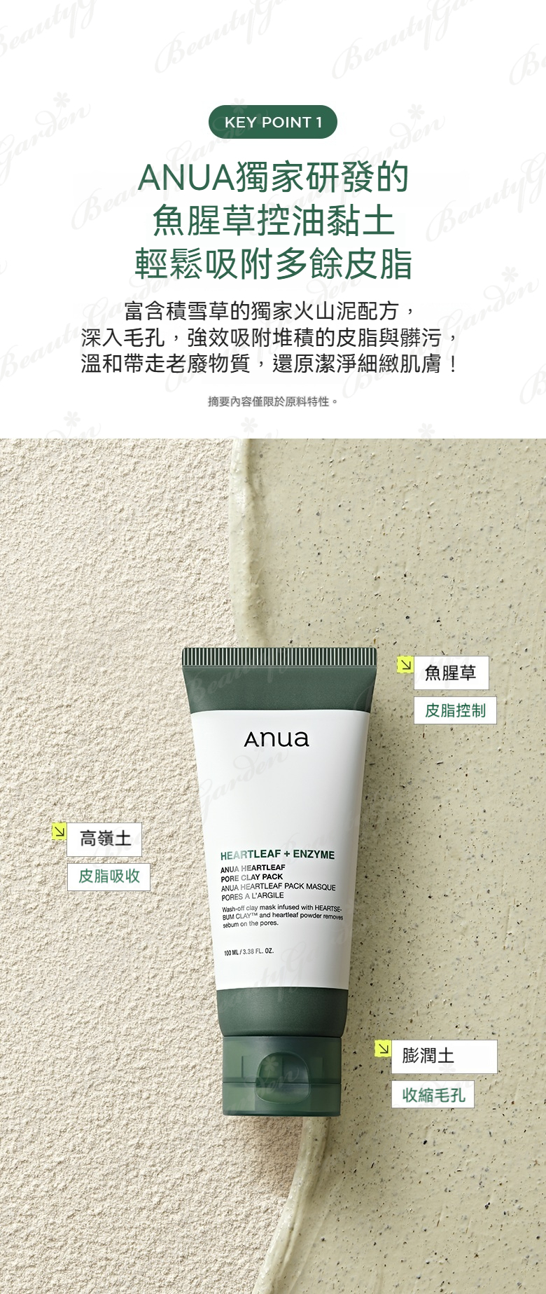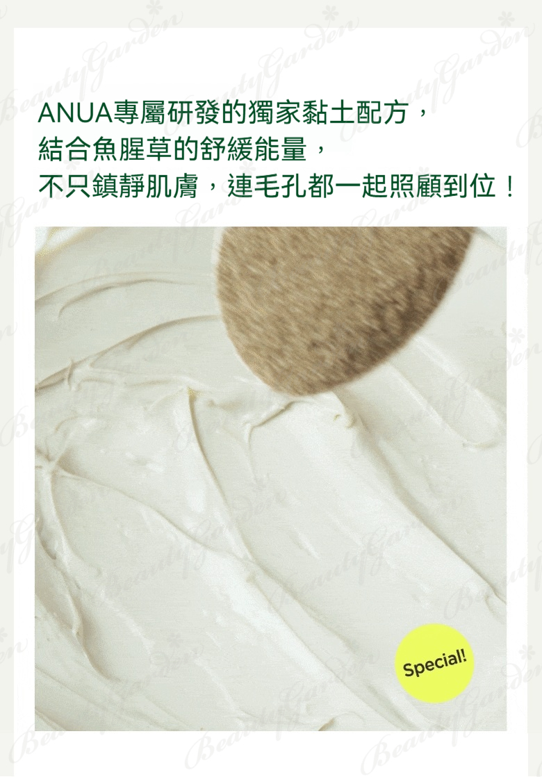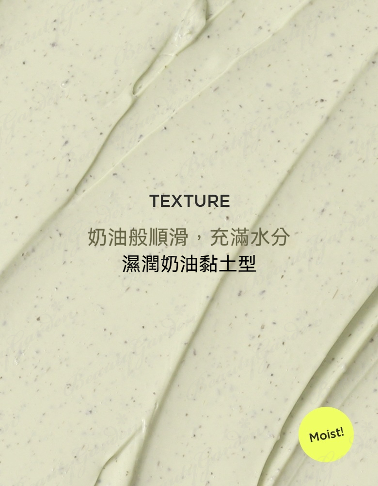 - 深層清潔、溫和去角質:含有高比例的高嶺土(Kaolin 20%)和膨潤土(Bentonite 35,000ppm),能夠深入毛孔,吸附多餘油脂與雜質,溫和去除老廢角質,改善肌膚粗糙問題。