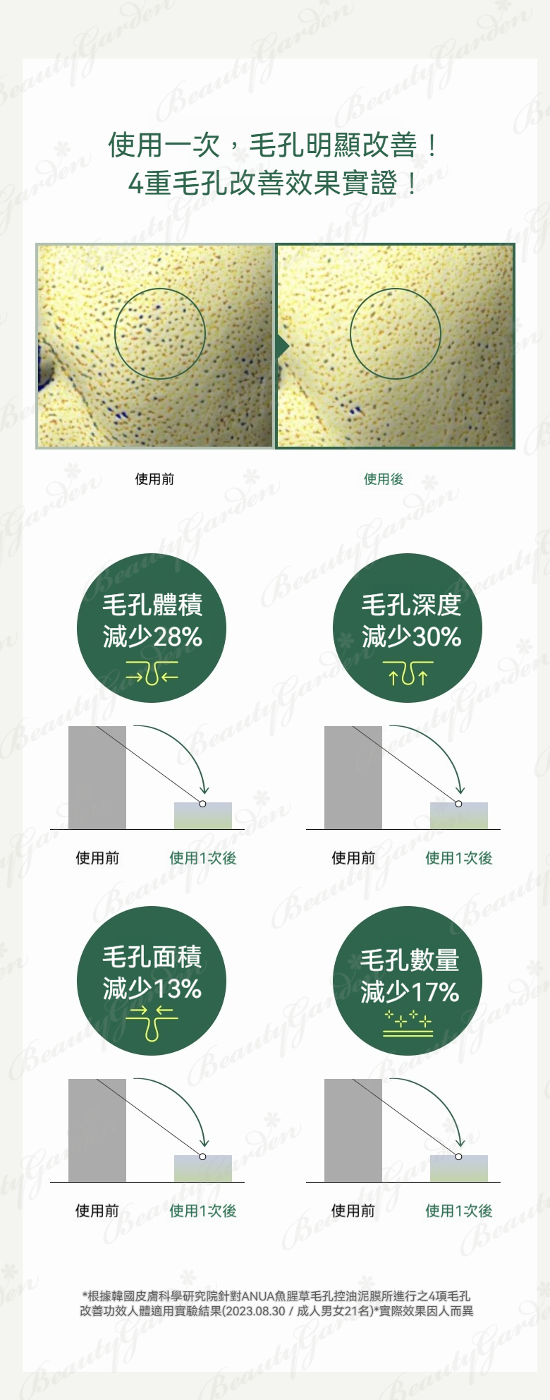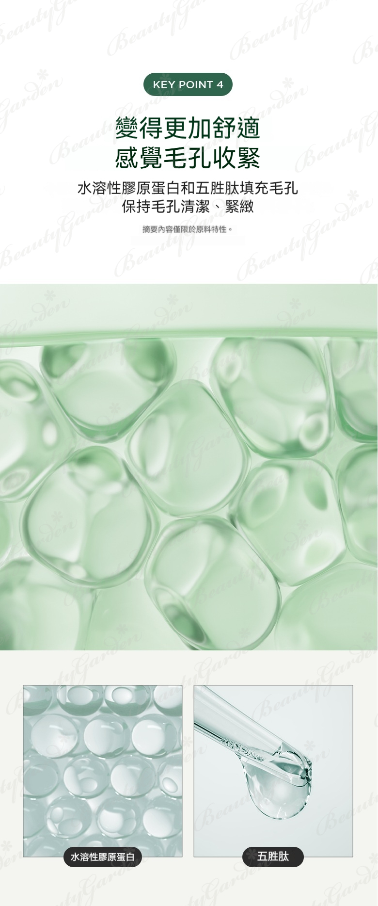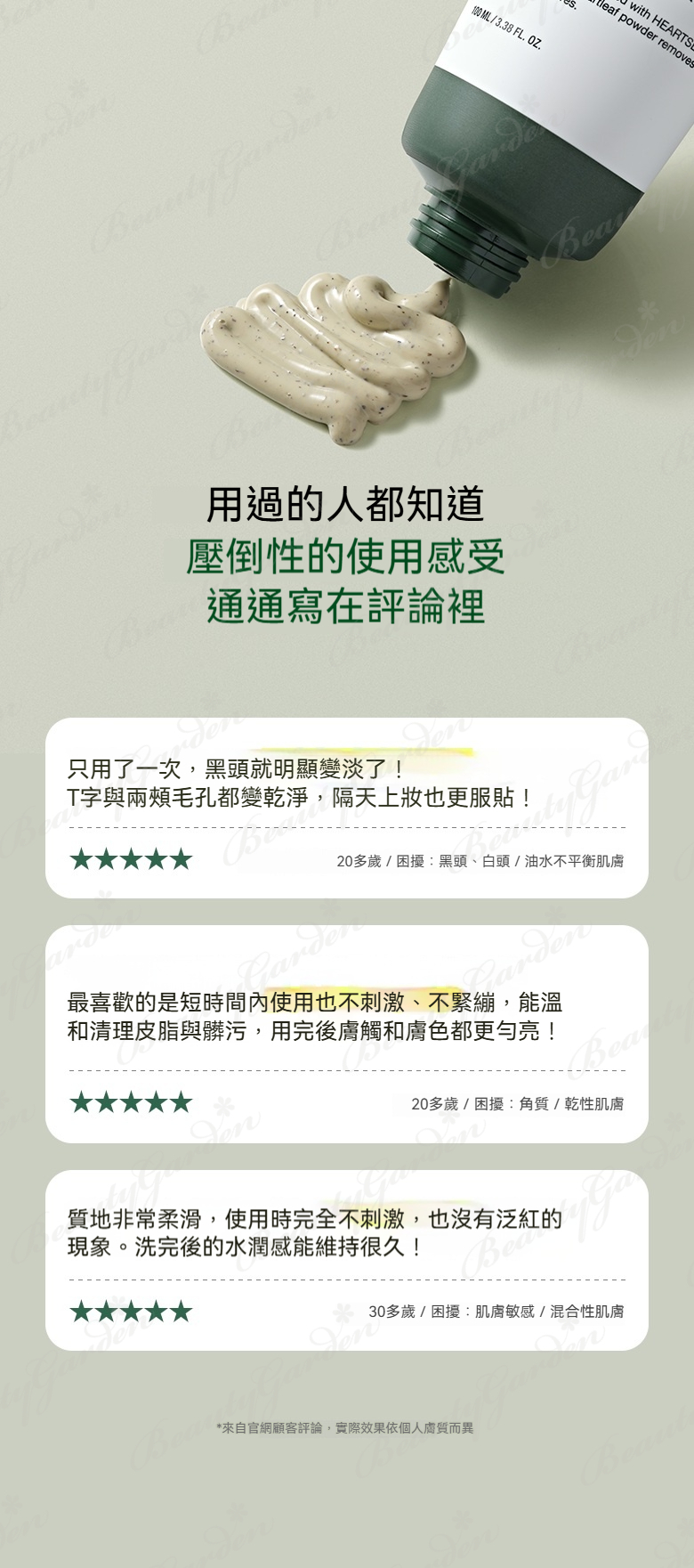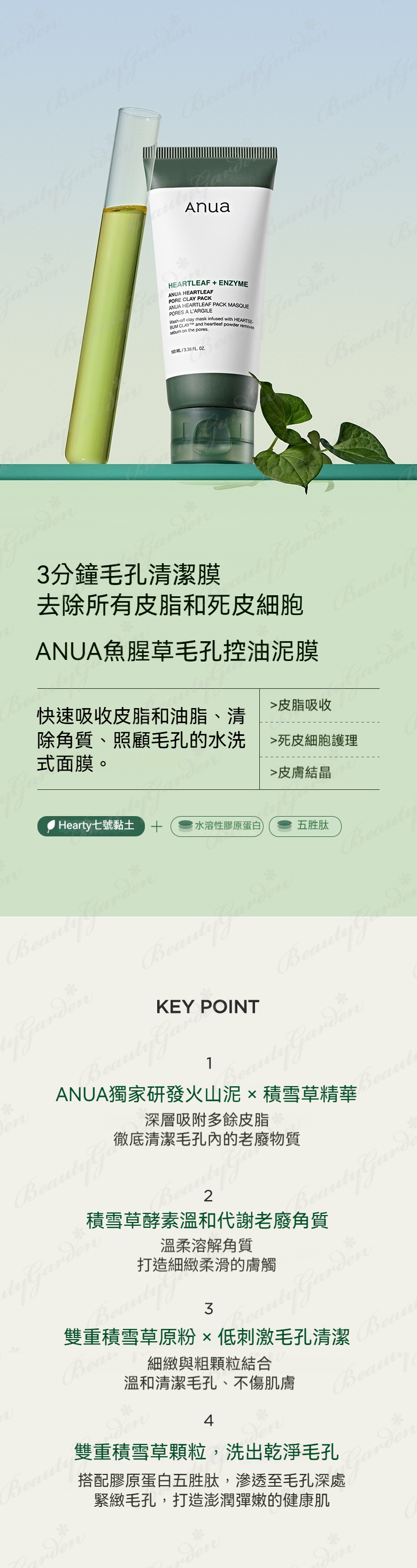 - 深層清潔、溫和去角質:含有高比例的高嶺土(Kaolin 20%)和膨潤土(Bentonite 35,000ppm),能夠深入毛孔,吸附多餘油脂與雜質,溫和去除老廢角質,改善肌膚粗糙問題。