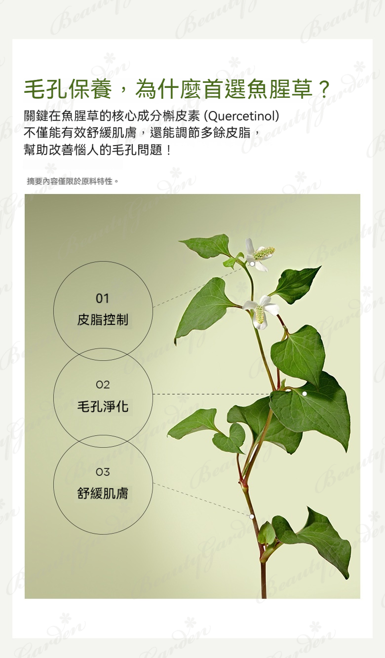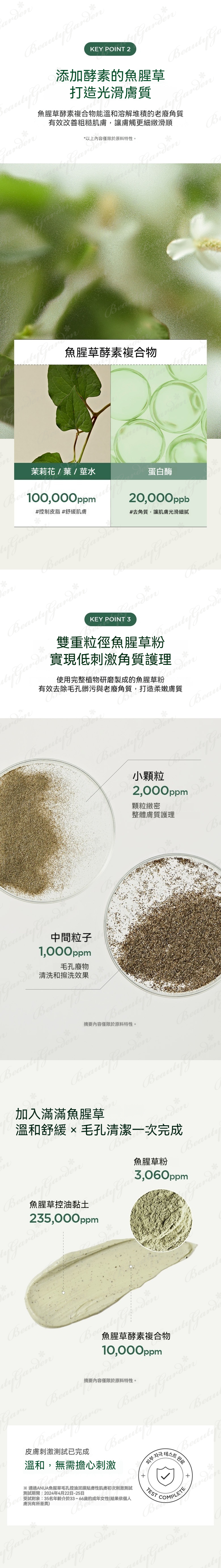 - 舒緩、抗氧化:添加10.1%的魚腥草萃取(Houttuynia Cordata Extract)和槲皮素(Quercetin),具有抗發炎和抗氧化作用,有助減少肌膚紅腫與敏感,強化肌膚屏障。