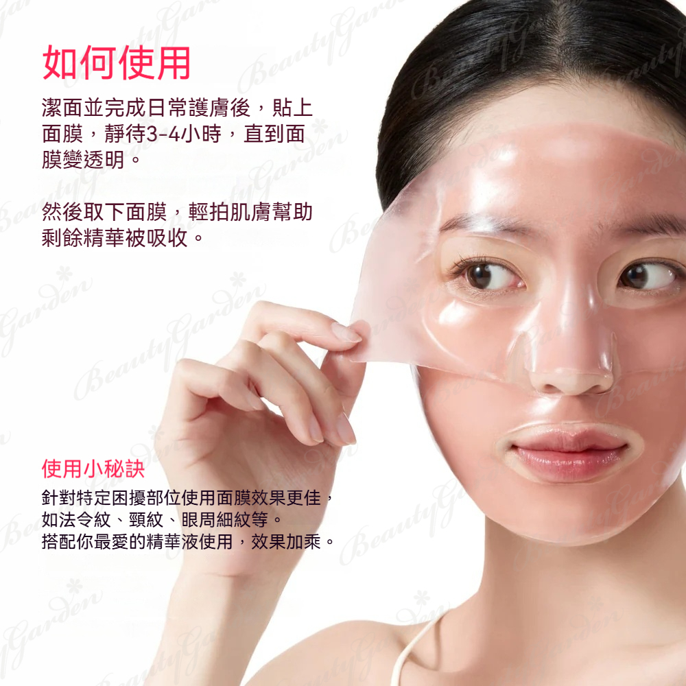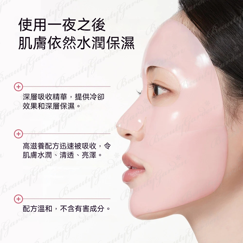 - 超薄1mm水凝膠面膜:輕薄貼合肌膚,適合長時間或過夜使用,提供深層保濕,同時溫和不刺激。