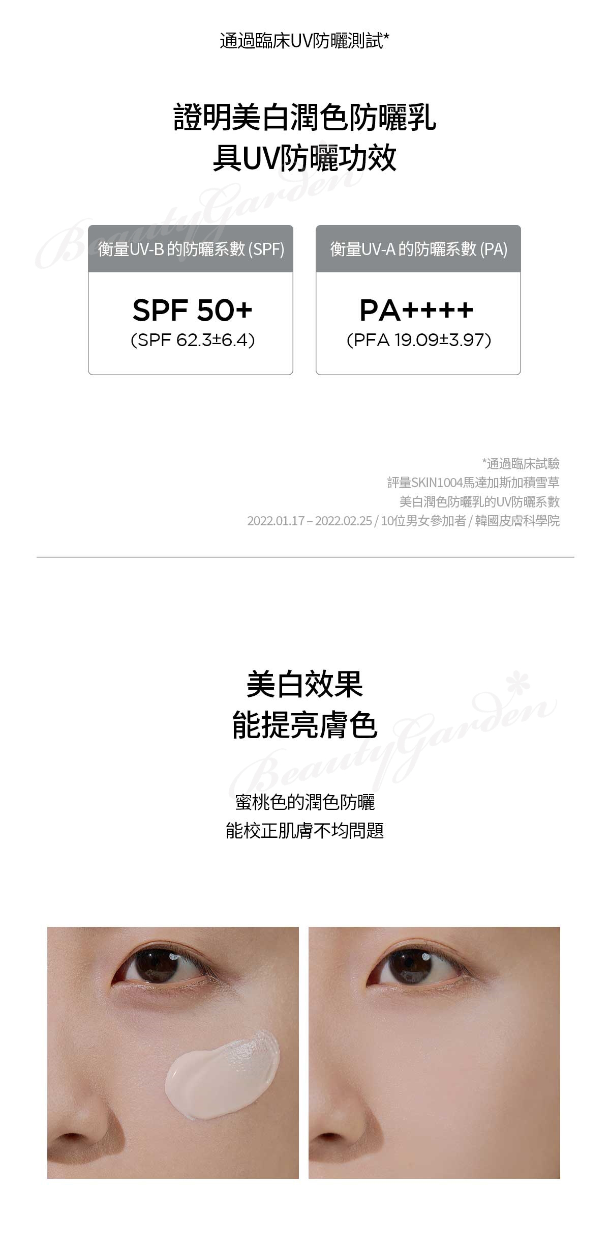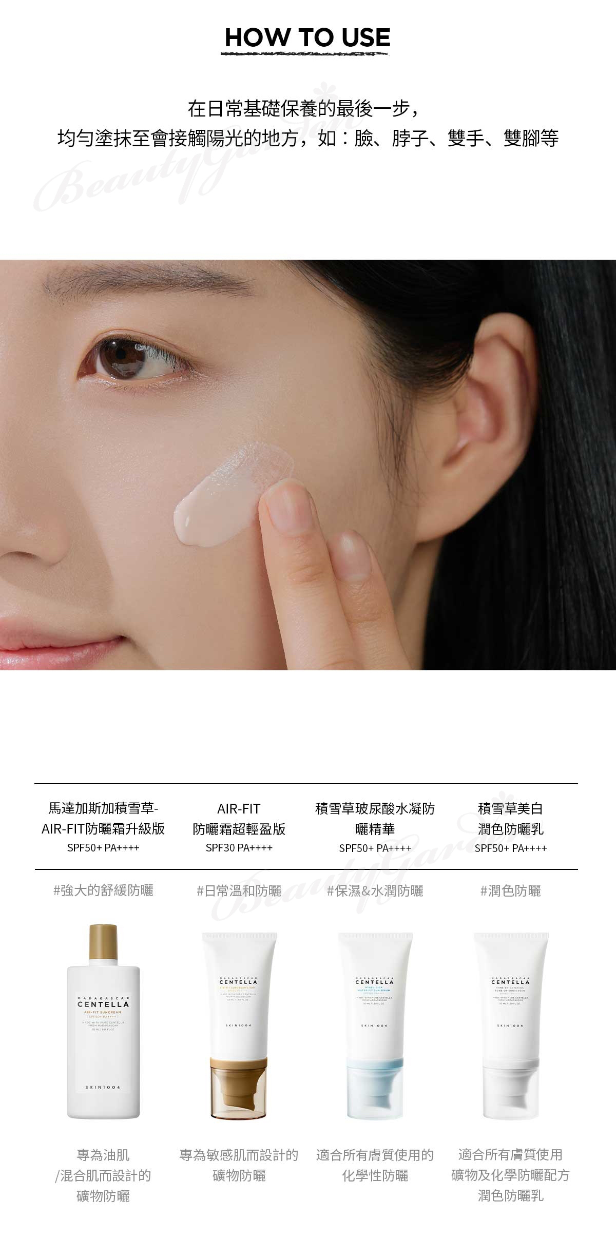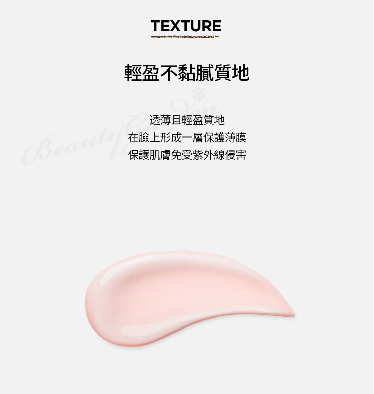 - 在基礎護膚的最後一步,均勻塗抹於臉部、頸部、手臂、腿部等容易受到紫外線照射的部位。