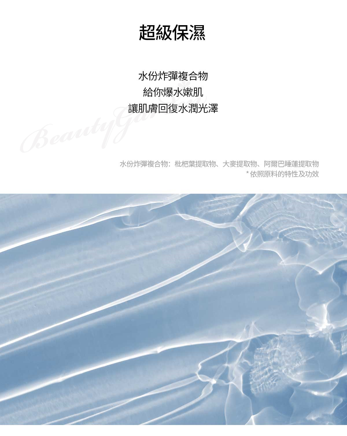 - 積雪草和 Aqua Bomb 複合物提供舒緩和保濕作用