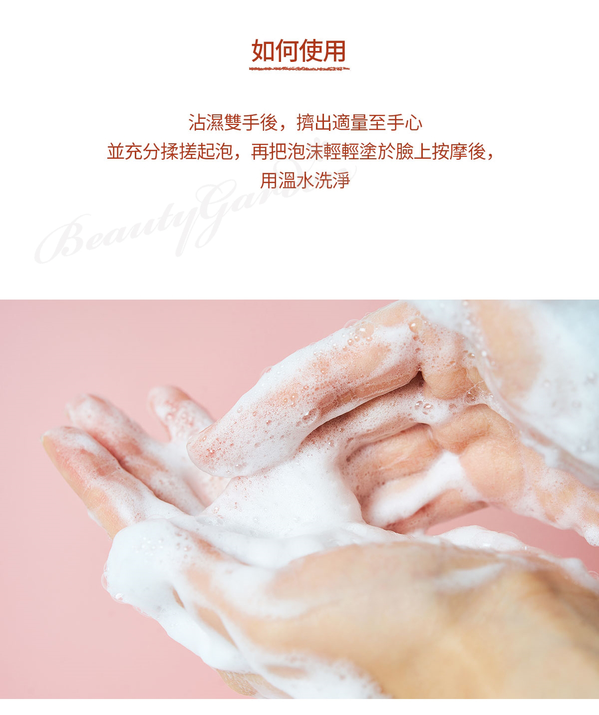 取適量於濕潤的手掌上並揉搓以產生泡沫。 輕輕按摩臉部,然後用溫水沖洗。 徹底沖洗。