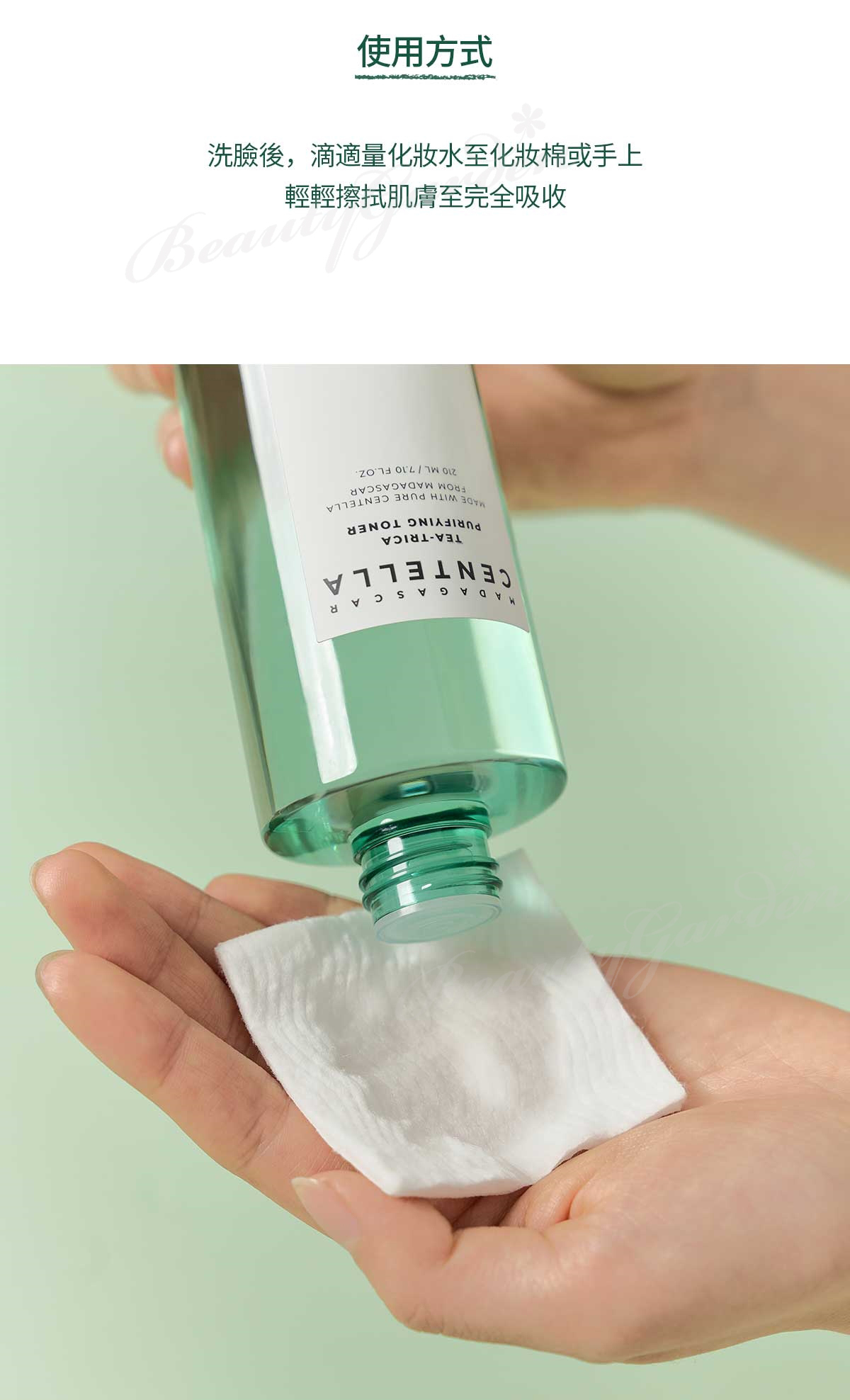 - 潔面後,取適量產品於化妝棉或手上。