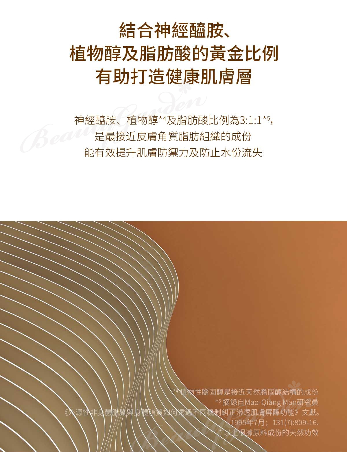- 以3:1:1的黃金比例含有肌膚脂質等成分, 賦予肌膚水分。