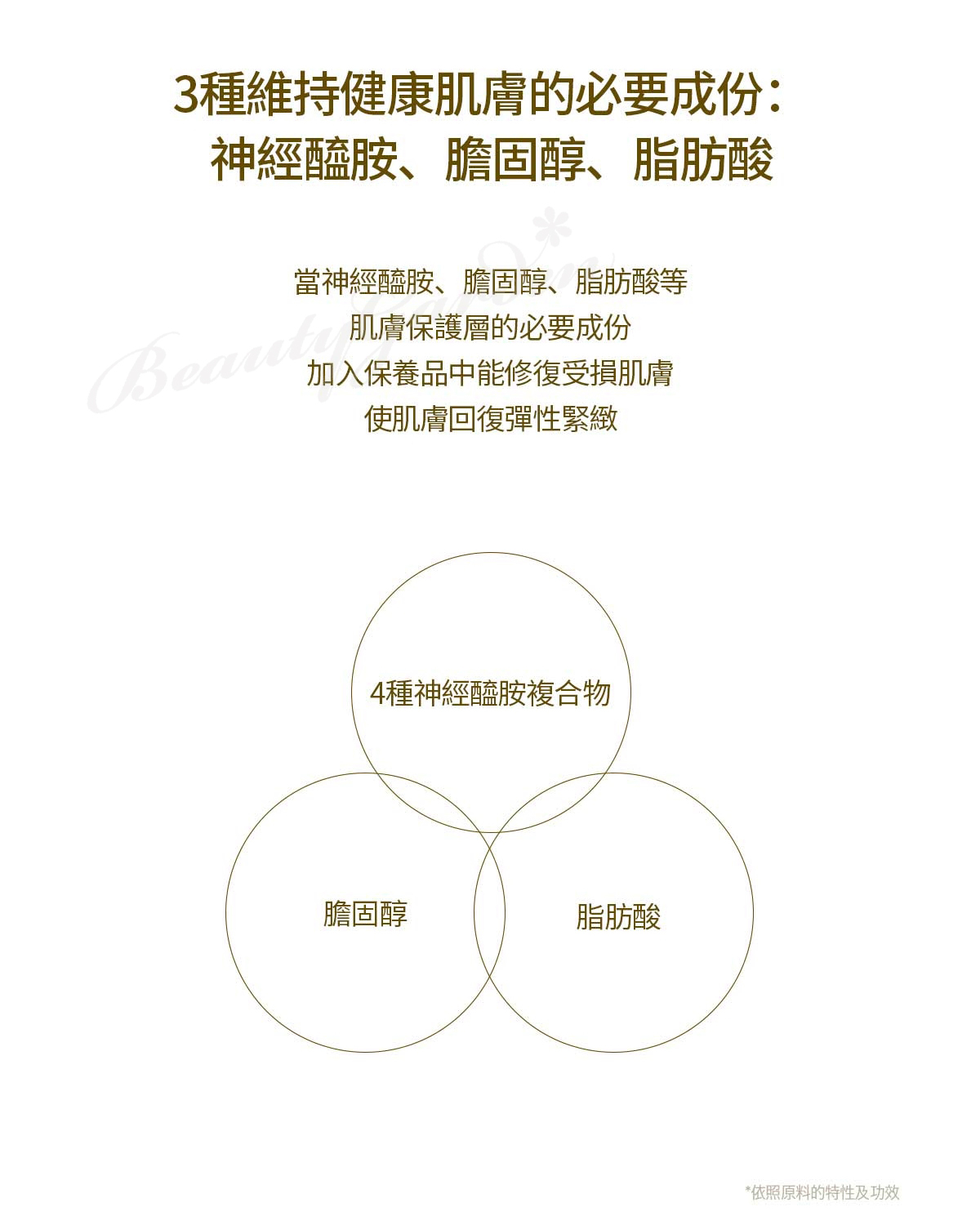 - 神經醯胺 NP + 膽固醇 + 脂肪酸:模擬皮膚天然脂質,修護屏障、鎖水保濕、提升柔嫩與彈性
