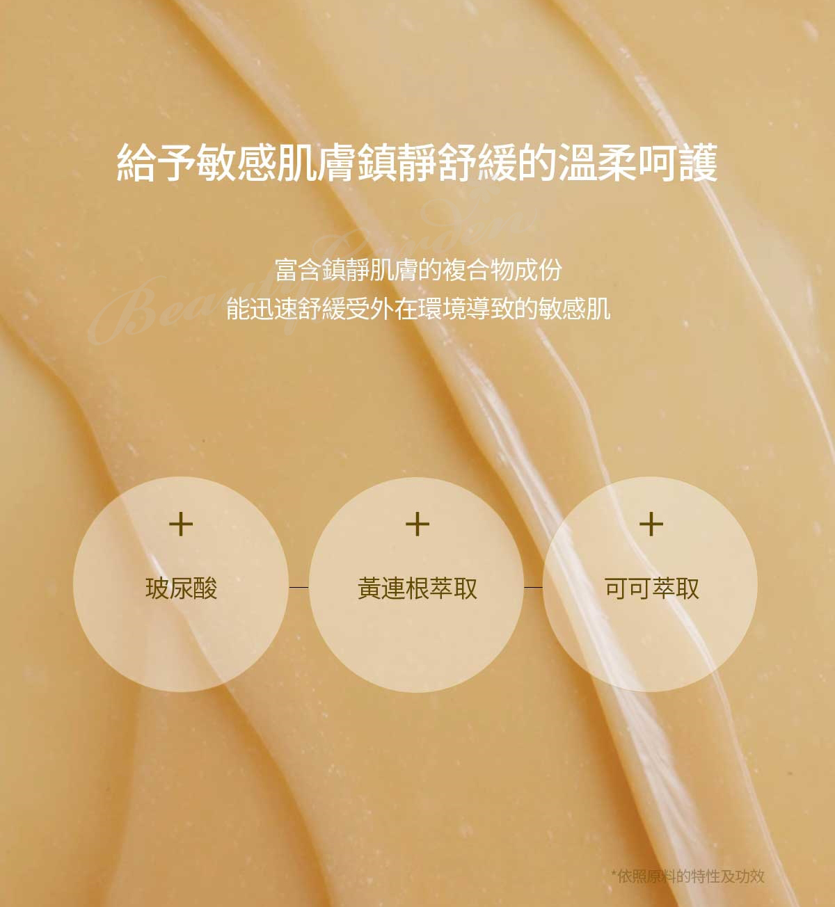 - 含半乳醣甘露糖Trehalose與低分子透明質酸 + β Glucan:提供即時與長效補水,同時防護皮膚免受環境刺激