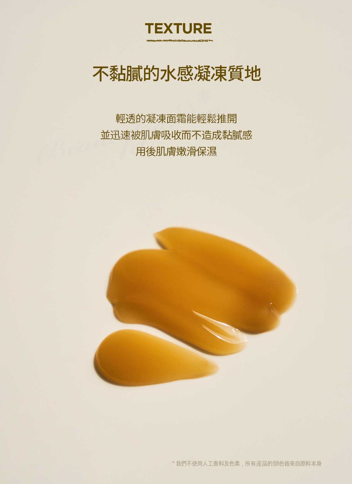 - 質地凝露清爽、不黏膩,吸收快:適合日常使用或做為妝前潤膜服貼底霜使用