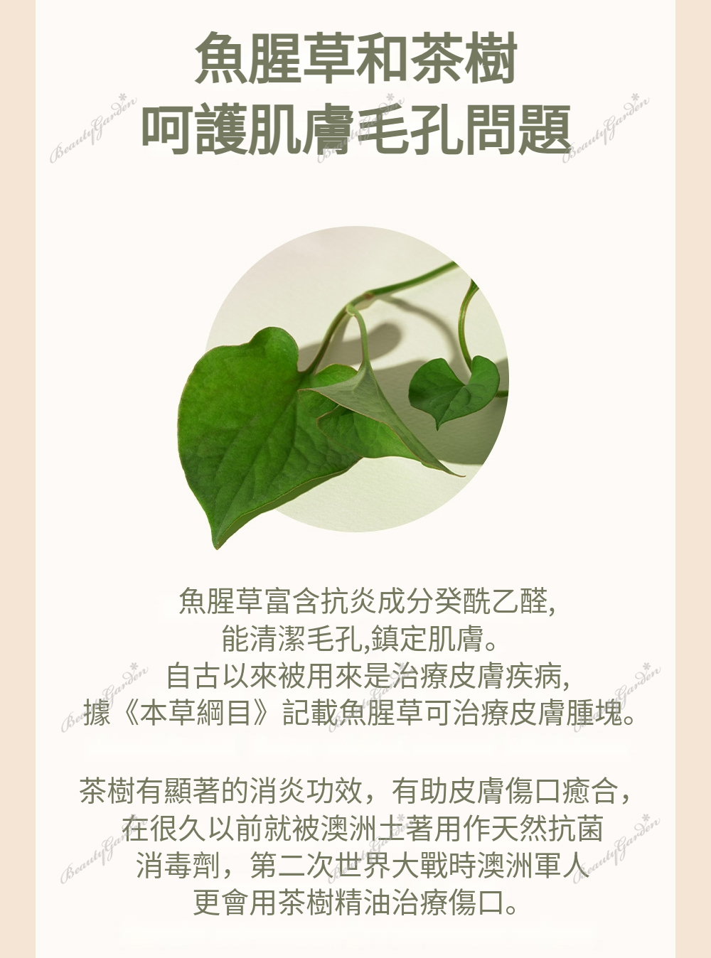 - 魚腥草萃取(Houttuynia Cordata Extract 40.7%):天然抗炎、消紅鎮靜,有效減少粉刺、痘痘及毛孔堵塞,舒緩敏感肌膚。