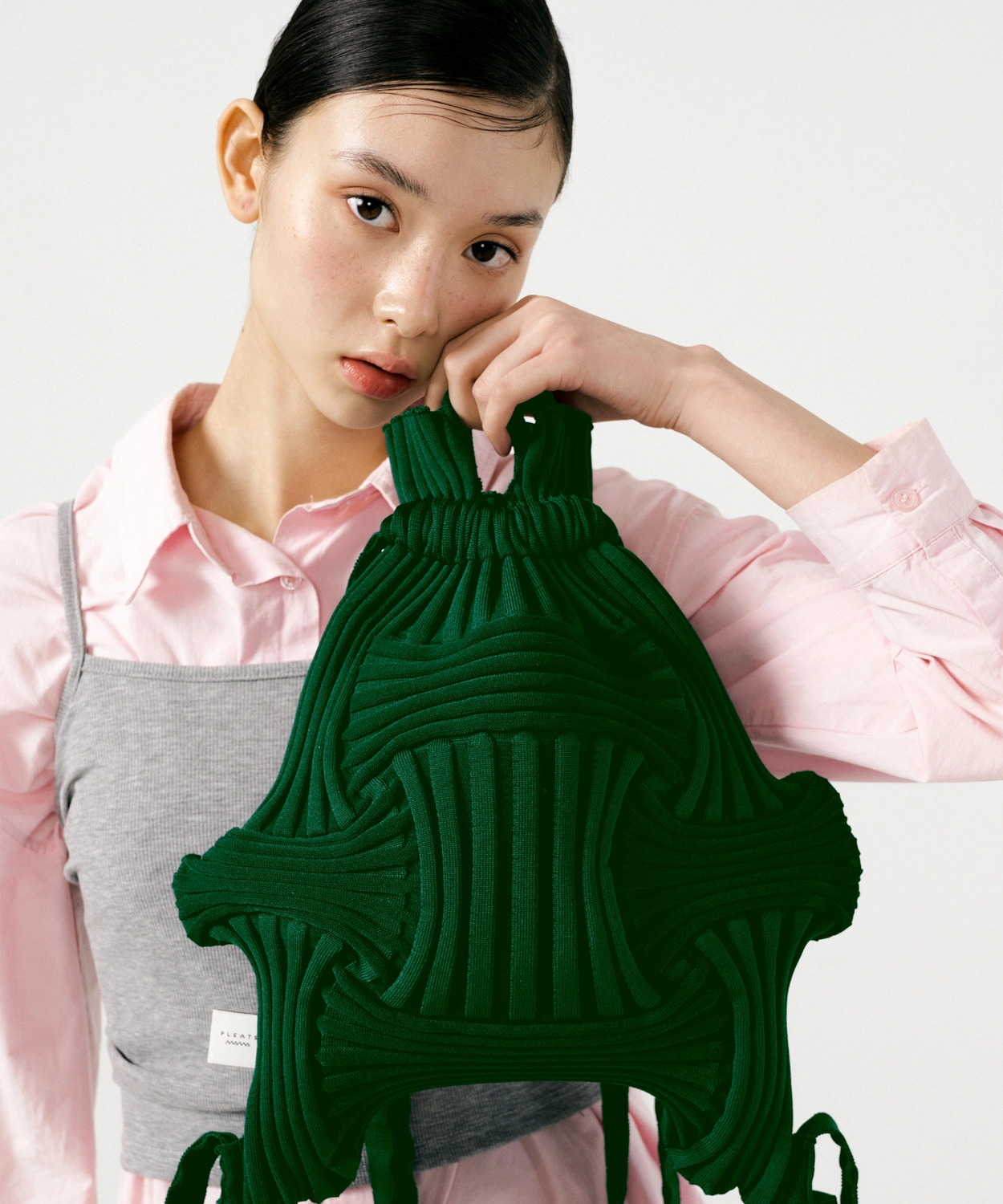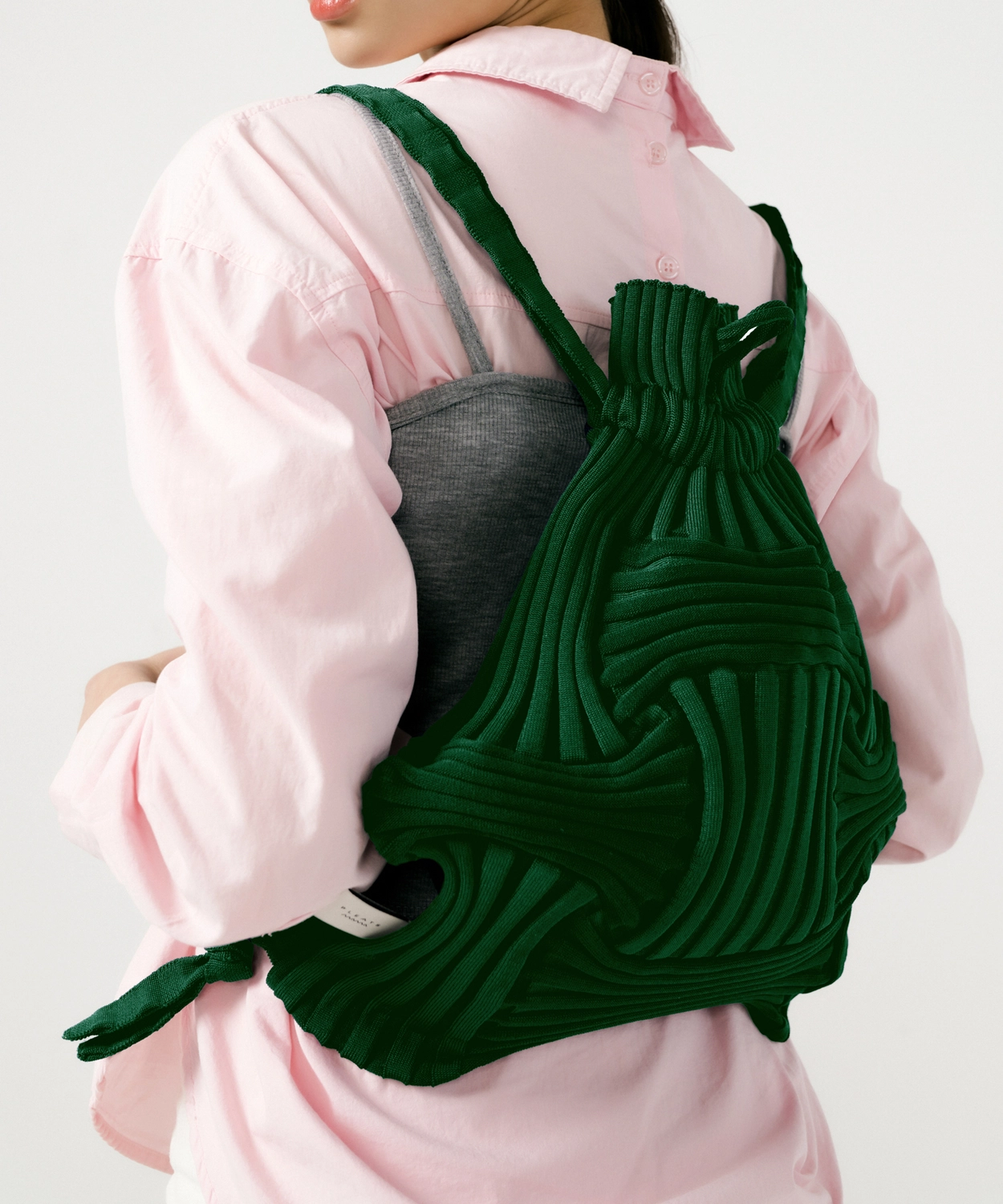 PLEATSMAMA New Bow Backpack 是品牌經典的百摺設計進化版,採用回收聚酯纖維及彈性纖維混紡材質,兼具環保與輕巧耐用。背包織物彈性強,能隨身體動作微幅變形,提升舒適度。肩帶採用壓花繩索設計,佩戴時保持張力及防滑,具三種背法變換:收緊肩帶可揹作雙肩包,放鬆可作手提包,方便多用途使用。內部空間充裕,可收納13寸筆電及日常必需品,設計簡約時尚,符合日常及通勤需求。