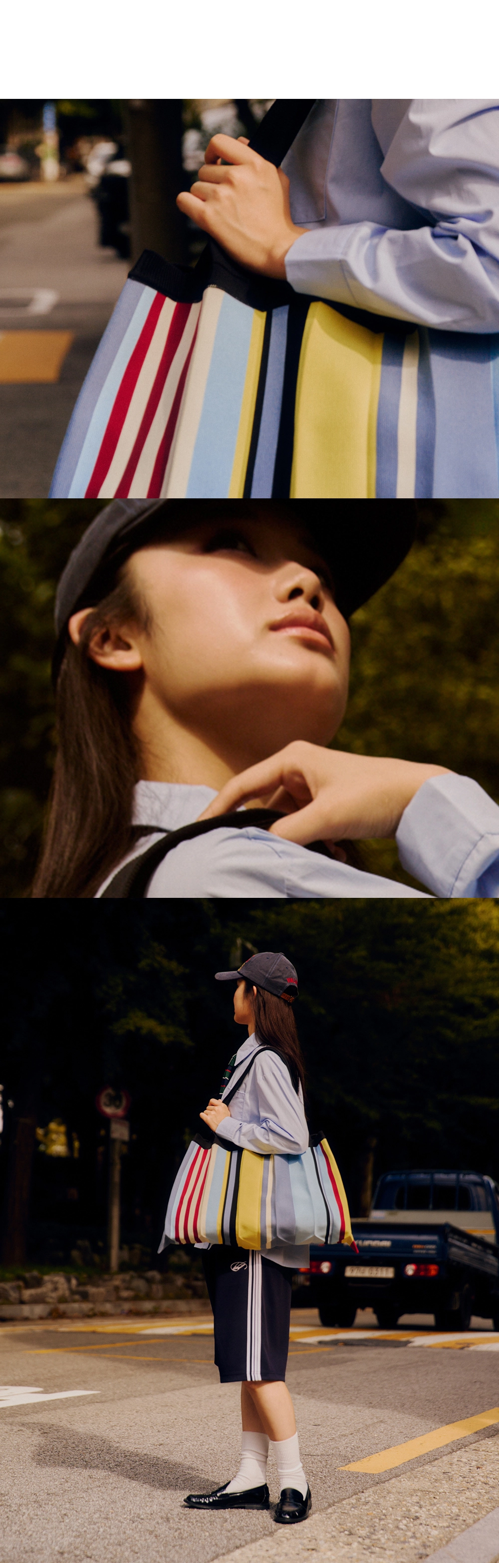 大容量肩背包選用環保回收纖維製作,袋身柔軟而充滿彈性,易於不同身形背負,適合日常攜帶或外出穿搭,簡約又強調細節質感,充分體現韓國時尚工藝與環保理念。