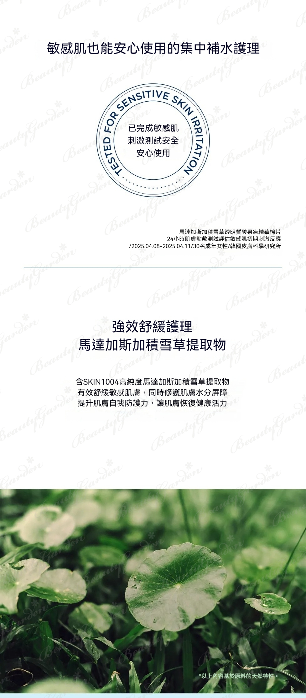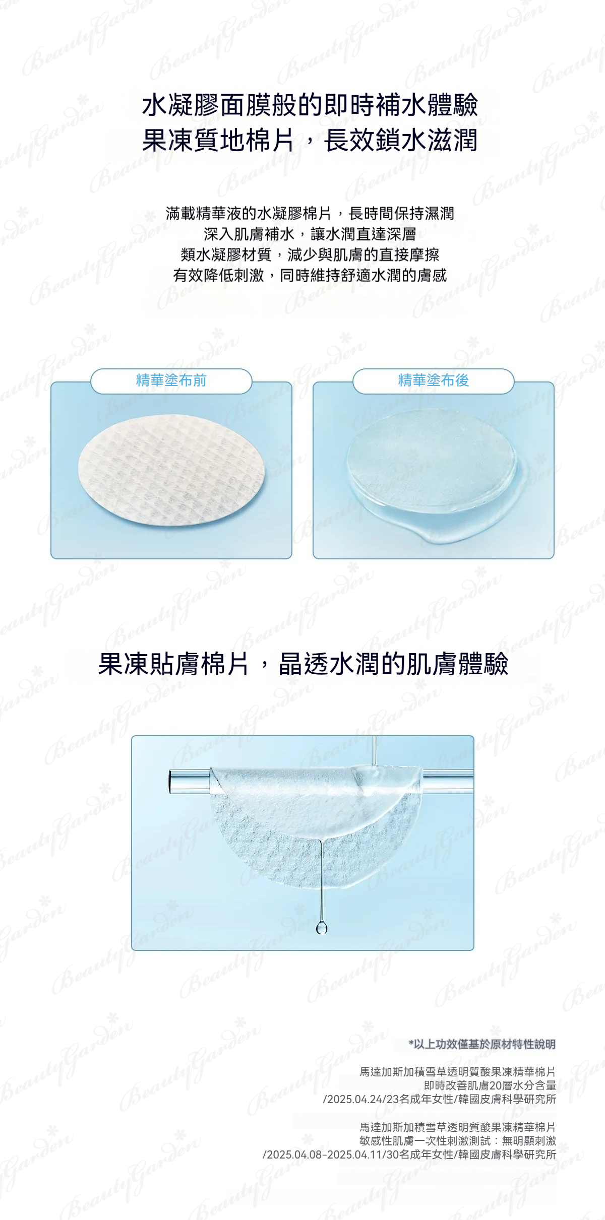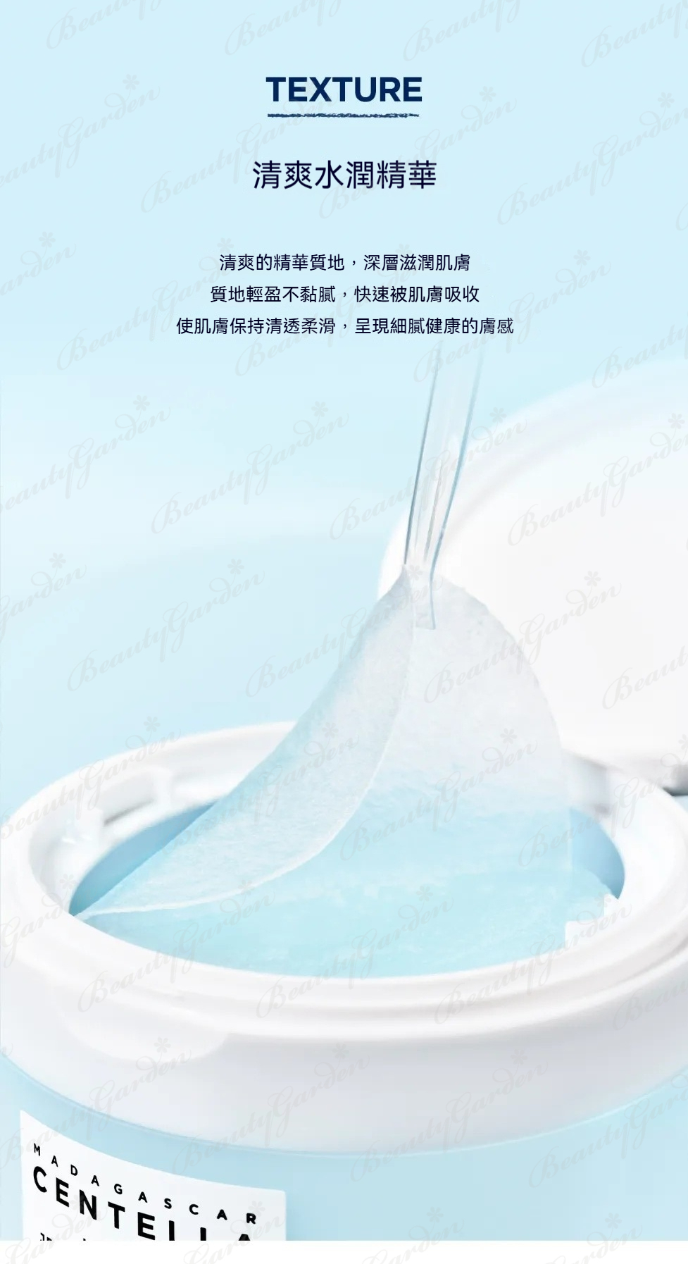 結合「高保濕+舒緩修護」的精華啫喱棉片,蘊含品牌核心 Madagascar 積雪草萃取及多重透明質酸複合成分,質地如果凍般清爽貼服。