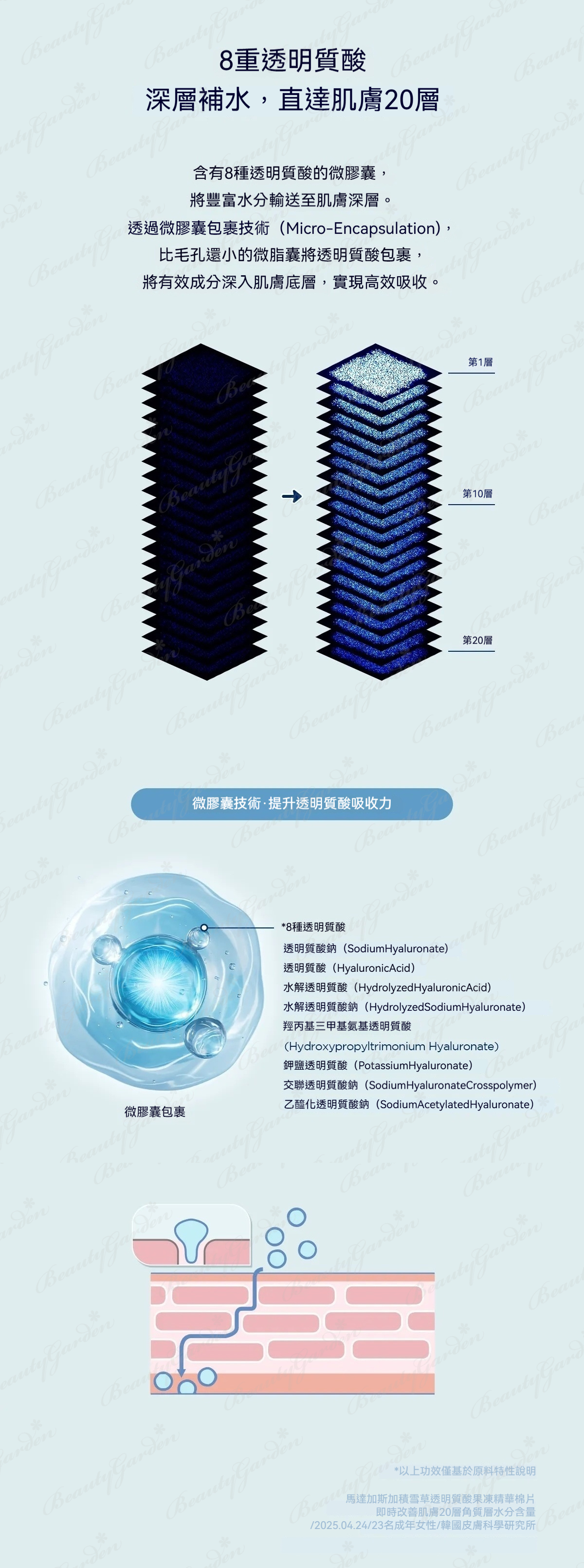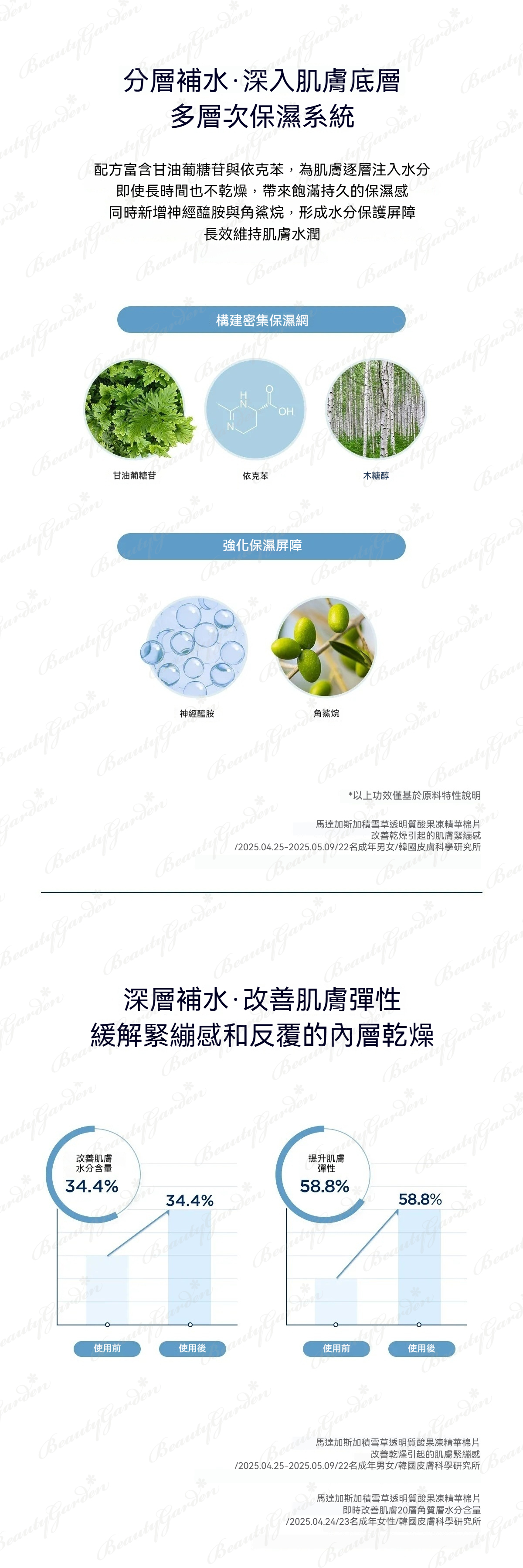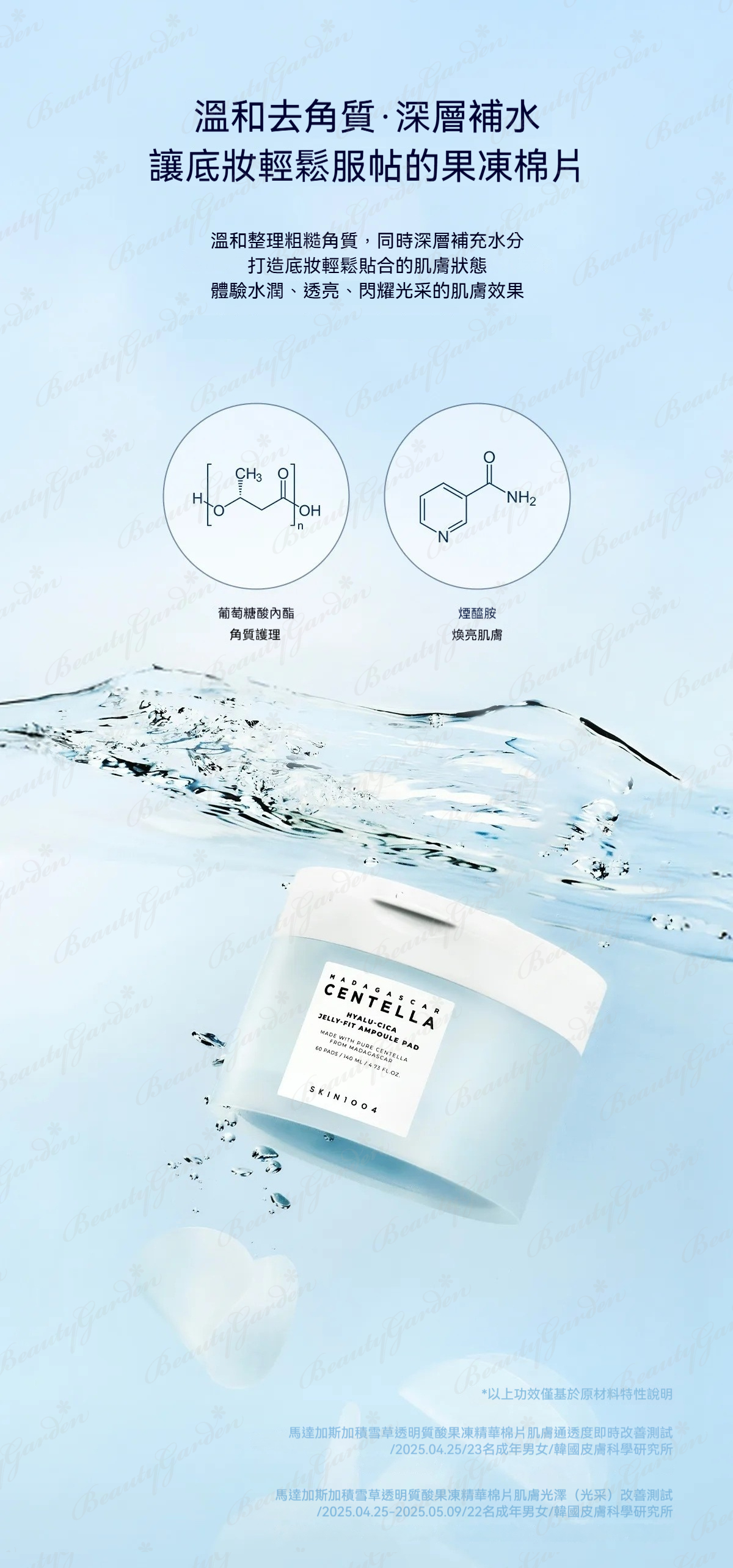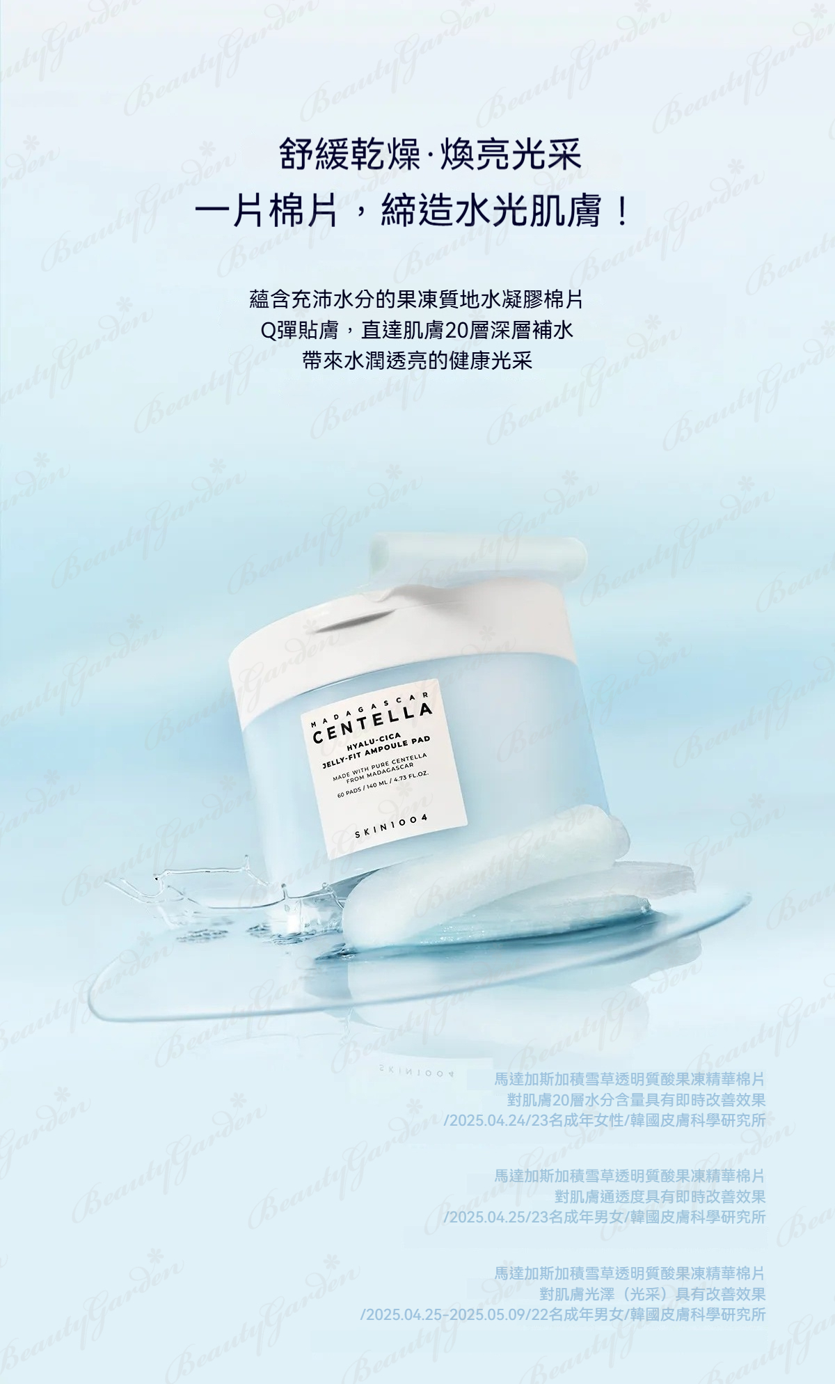 結合「高保濕+舒緩修護」的精華啫喱棉片,蘊含品牌核心 Madagascar 積雪草萃取及多重透明質酸複合成分,質地如果凍般清爽貼服。