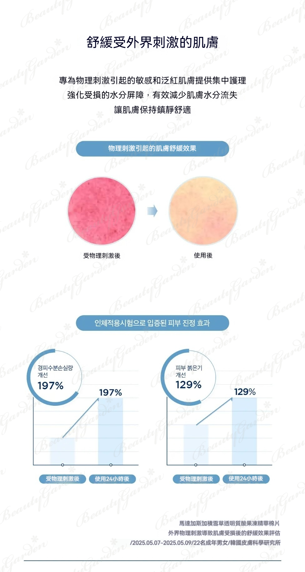 • Madagascar 積雪草萃取:強化肌膚屏障,改善敏感不穩定狀態